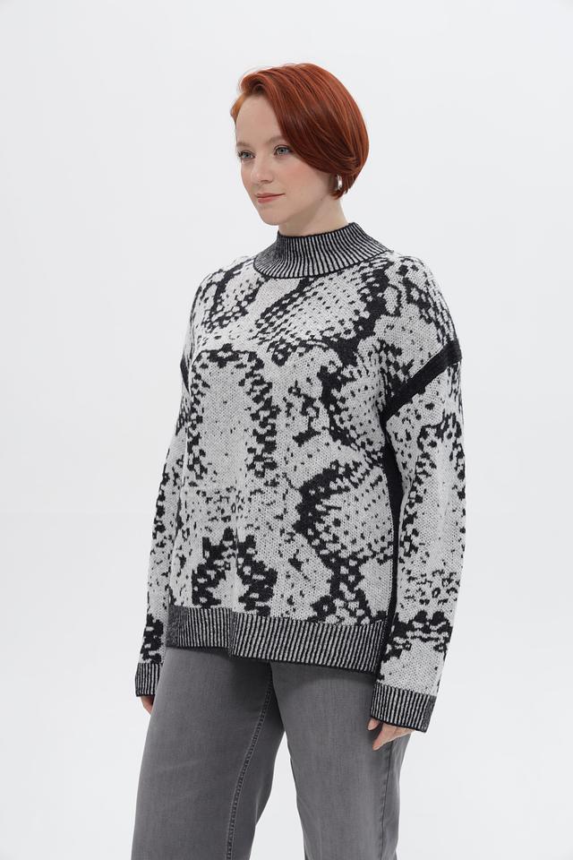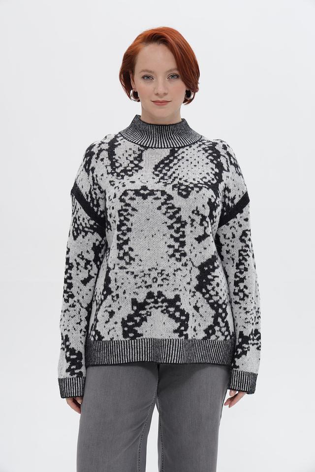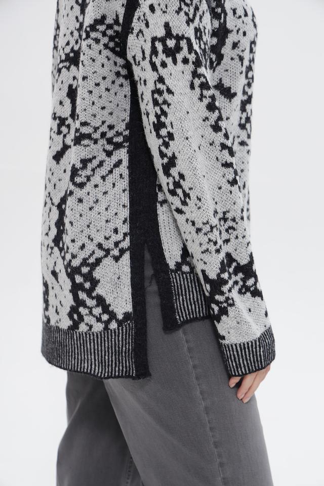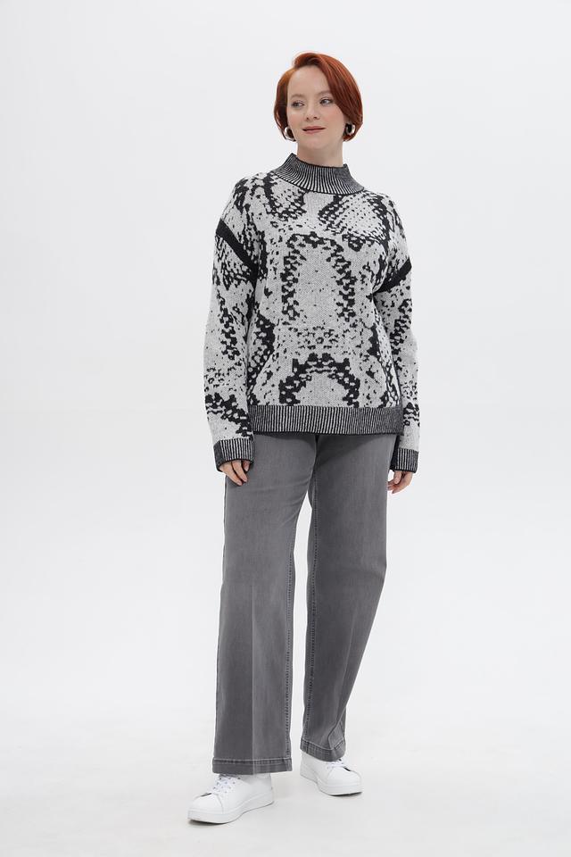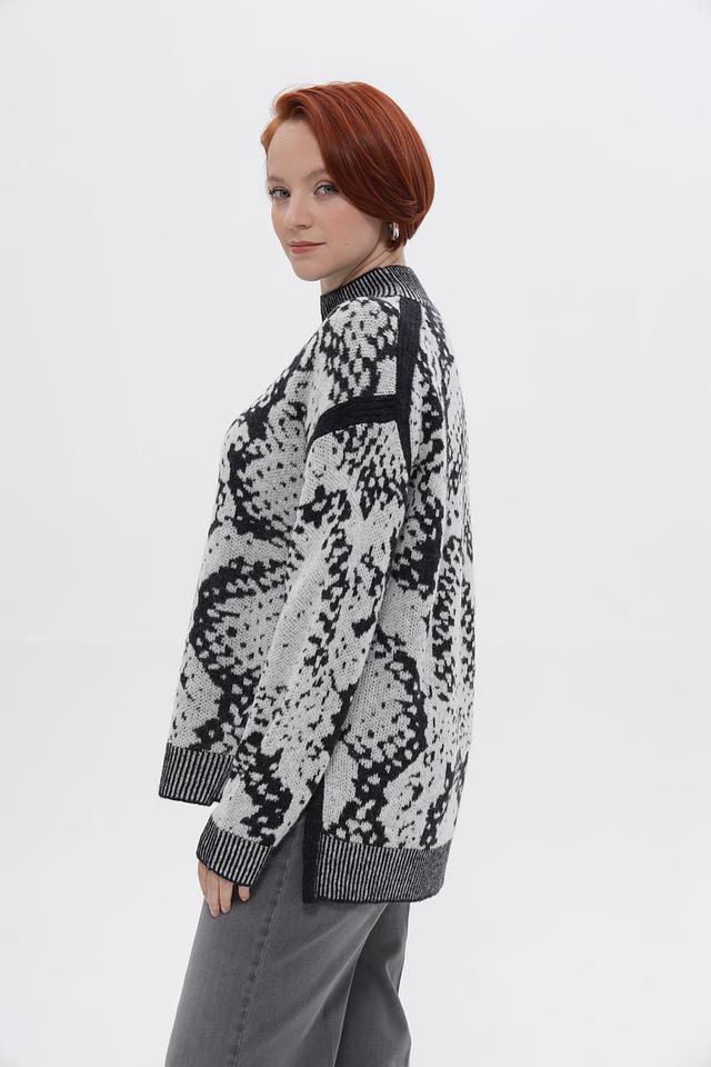 Пуловер имеет высокий воротник и свободный крой, обеспечивающий комфортную посадку по фигуре. Боковые разрезы добавляют динамики и позволяют создавать интересные многослойные образы.