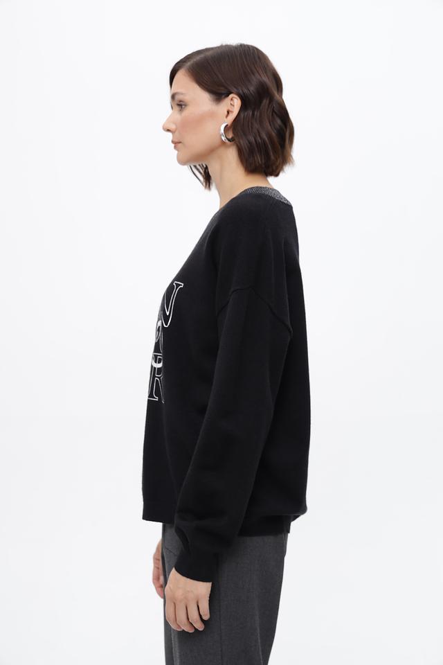 Пуловер имеет классический V-образный вырез, который подчеркивает зону декольте. Особый акцент сделан на декоративной вышивке логотипа бренда, выполненной в белом цвете с добавлением серебристой метализированной нити, придающей изделию блеск и элегантность.