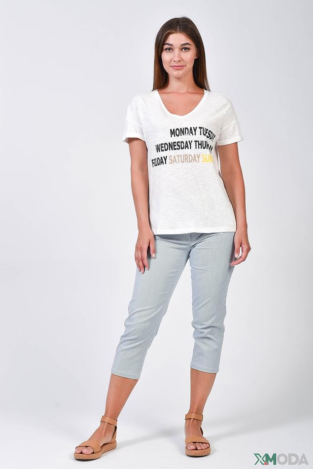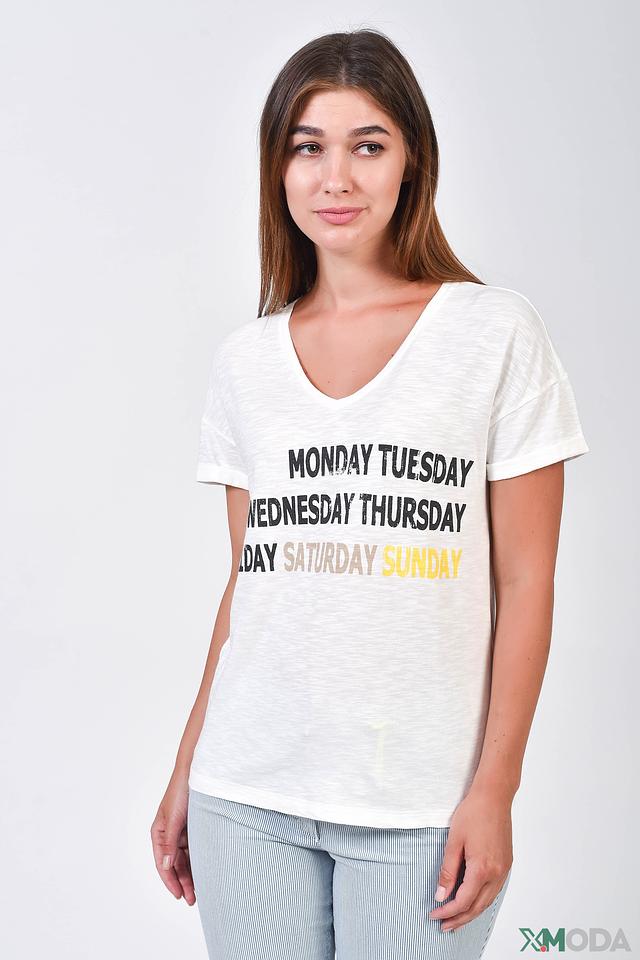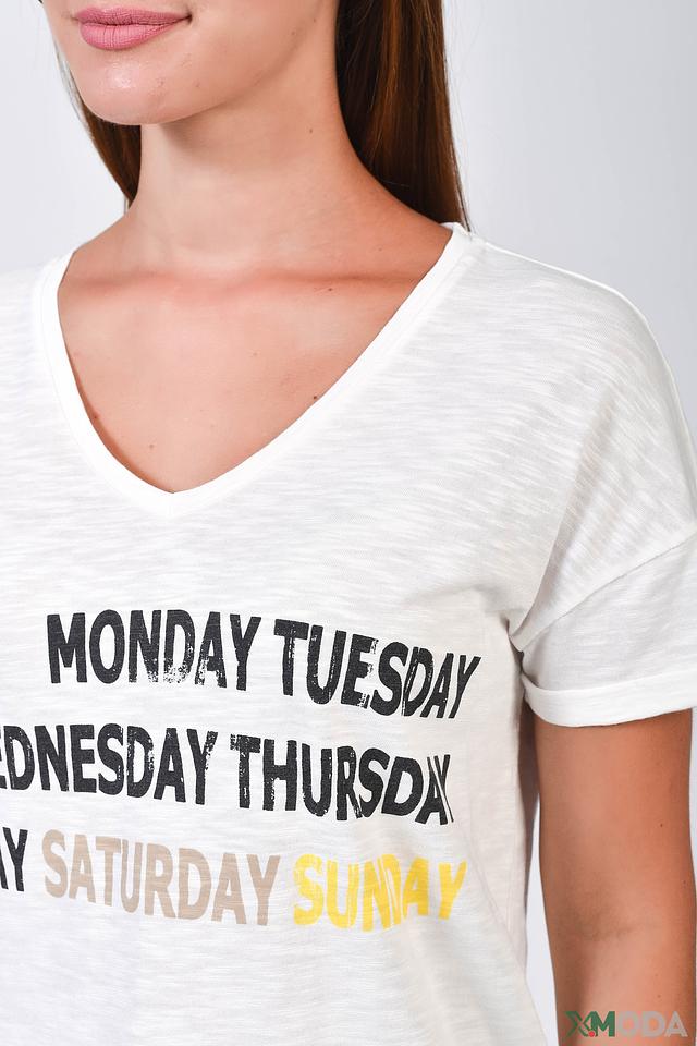 Особенностью данной модели является яркий принт с названиями дней недели, выполненный в различных цветах. Футболка имеет удобный V-образный вырез и короткие рукава с небольшим подворотом, что придает ей более расслабленный и непринужденный вид.