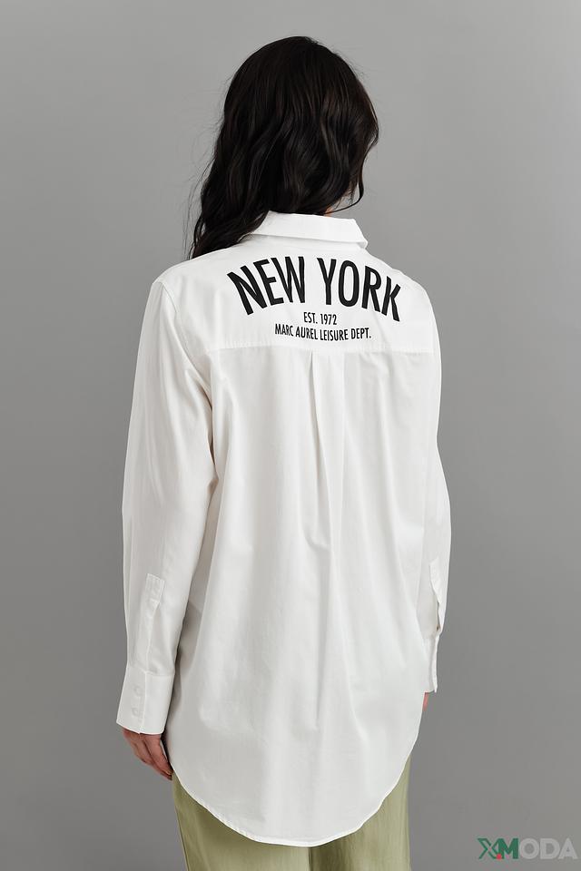 На спине рубашки размещен более крупный принт "NEW YORK EST. 1972 MARC AUREL LEISURE DEPT.", который подчеркивает современный стиль и динамичный характер бренда. Рубашка изготовлена из высококачественного 100% хлопка, что обеспечивает приятные тактильные ощущения и долговечность изделия.