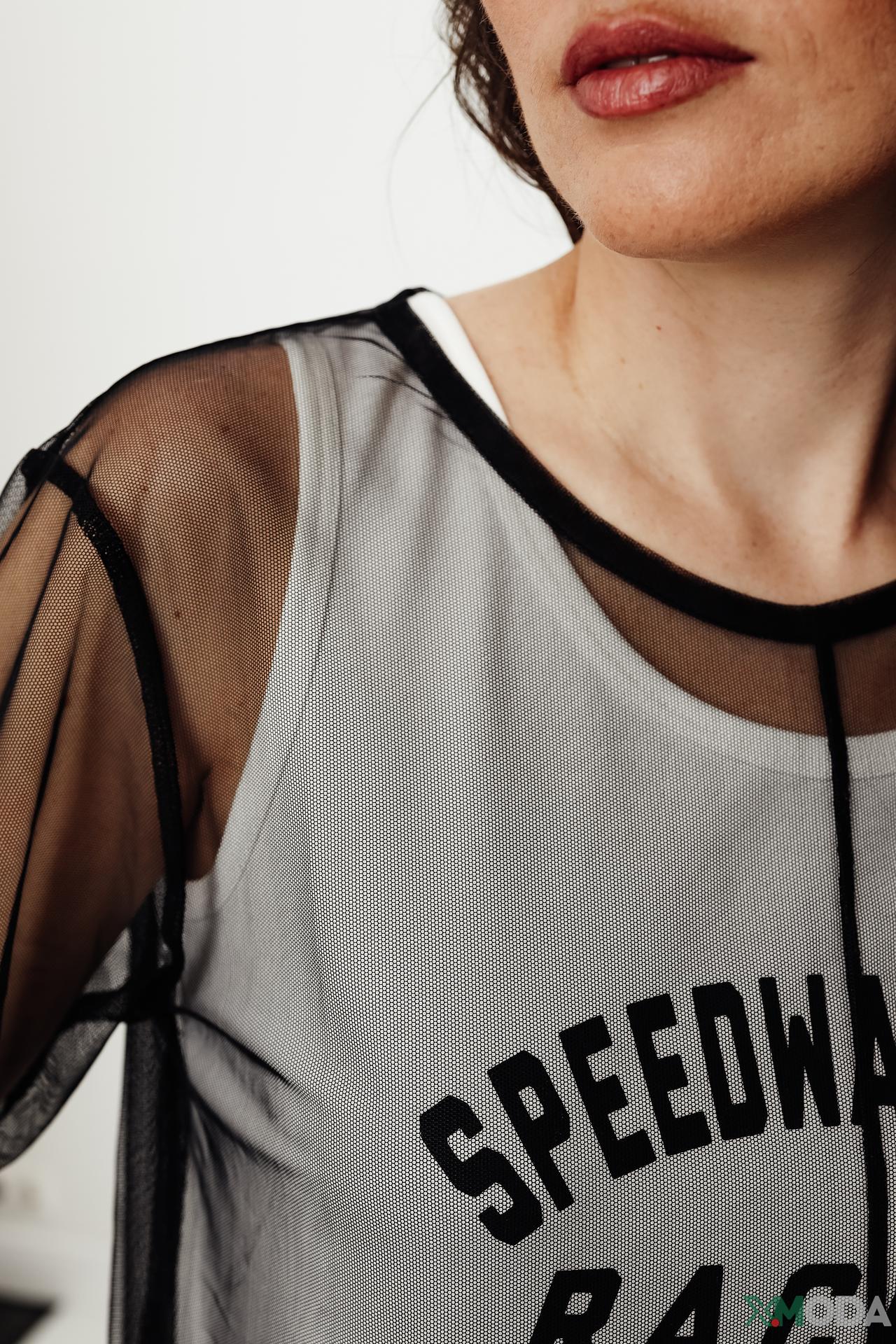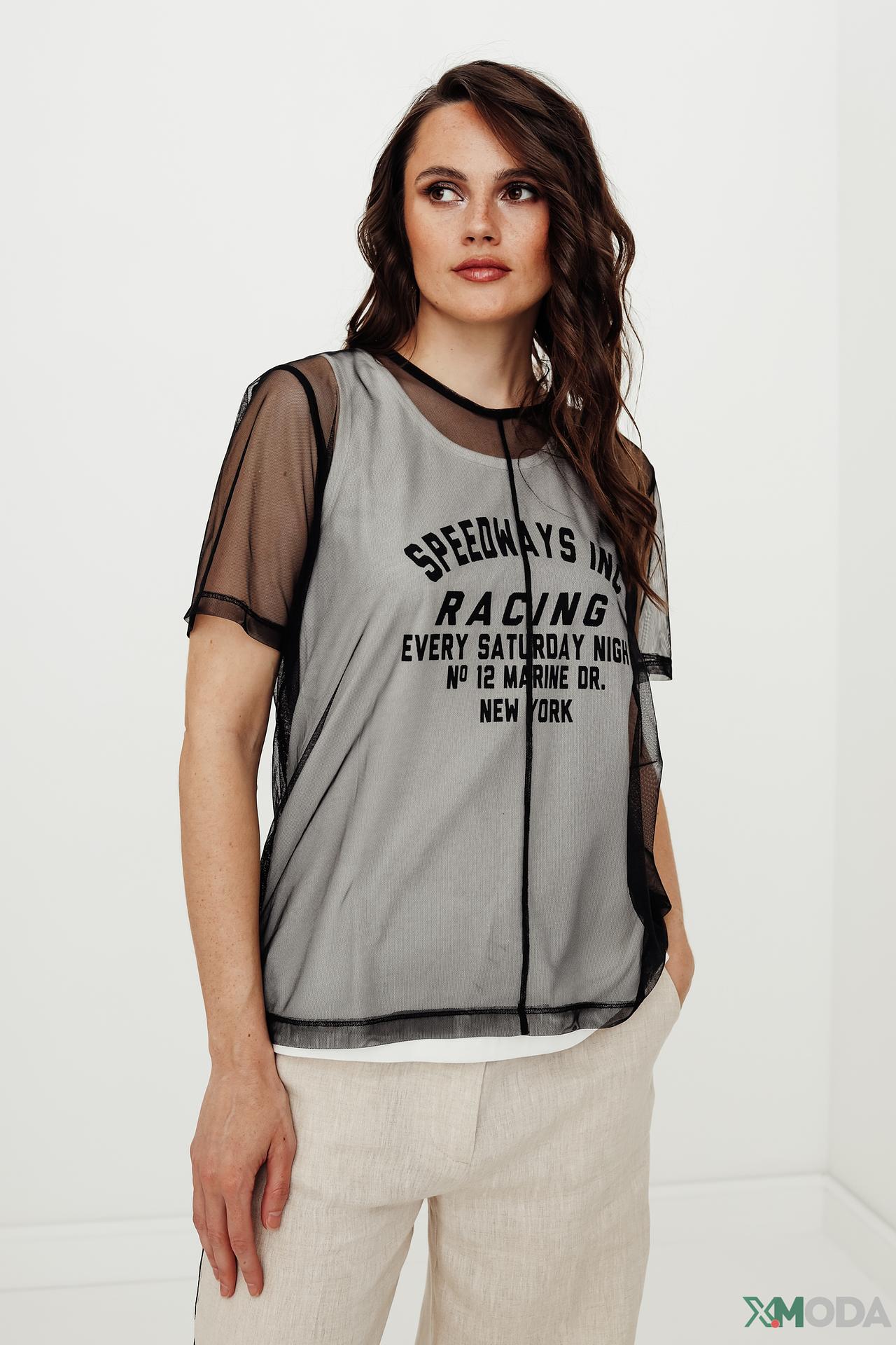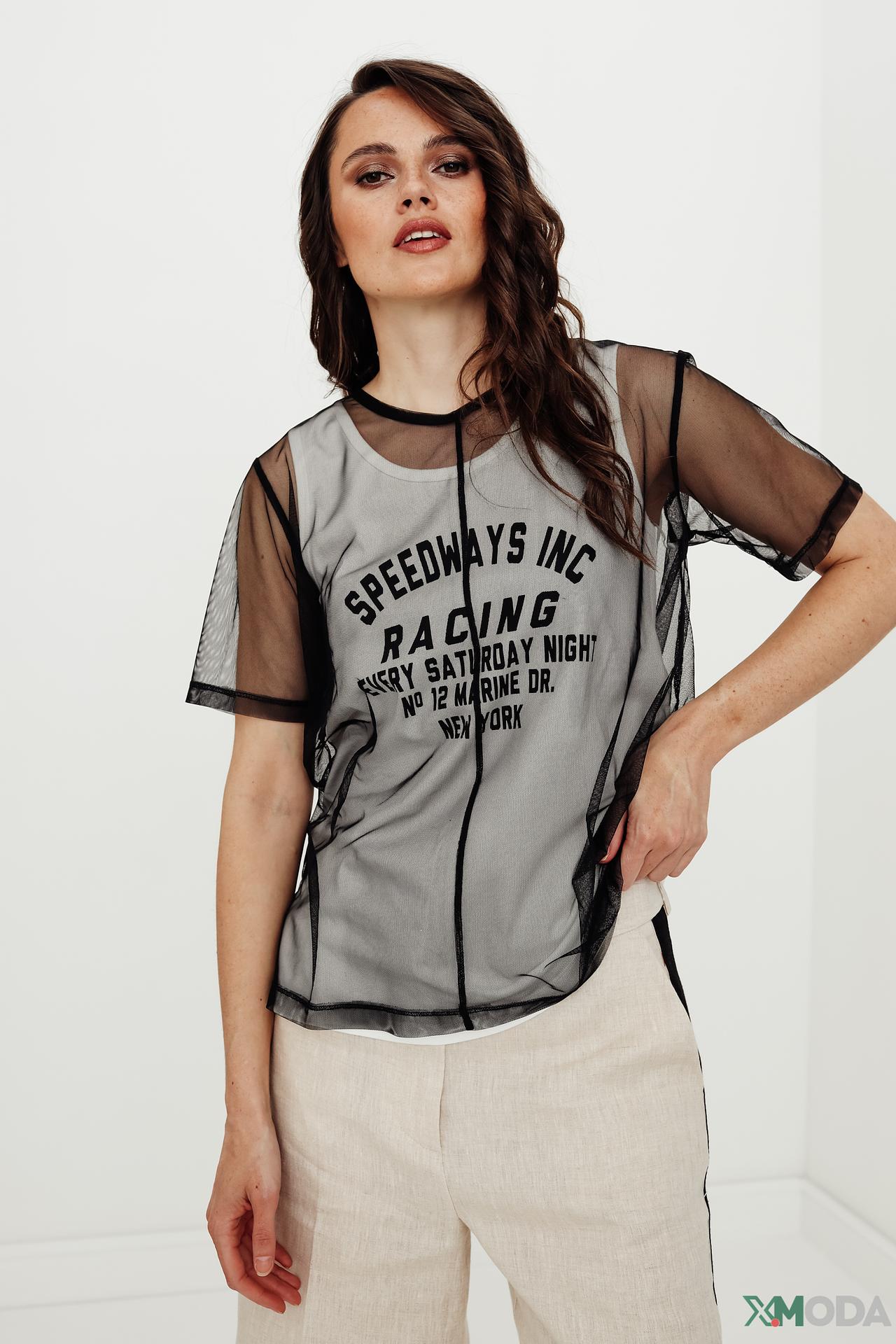 - Дизайн: Прозрачная сетчатая ткань с контрастным принтом создает интригующий внешний вид. Модель имеет короткий рукав и круглый вырез горловины, дополненные декоративными швами.