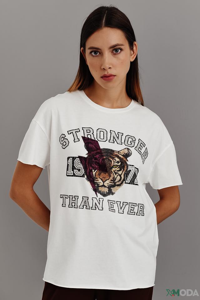 Основным акцентом футболки является яркий принт с изображением медведя и надписью "STRONGER THAN EVER". Этот принт добавляет образу оригинальности и индивидуальности.
