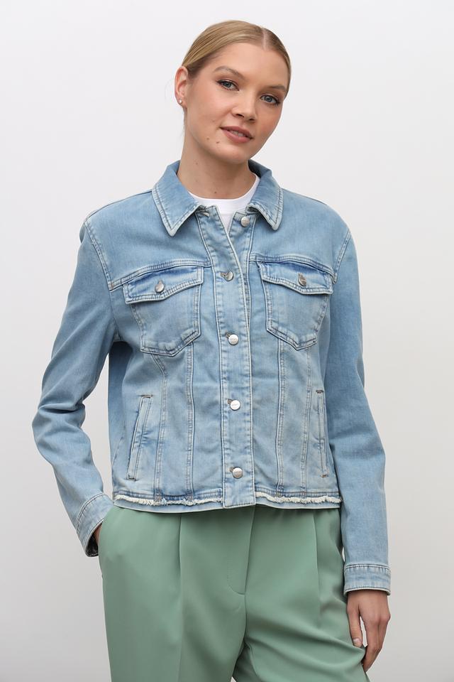 Два накладных кармана на груди добавляют функциональности, а светло-голубой цвет и эффект потертости делают этот жакет универсальным и подходящим для создания различных образов. Состав: хлопок 92%, эластомультиэстер 6%, эластан 2%.
