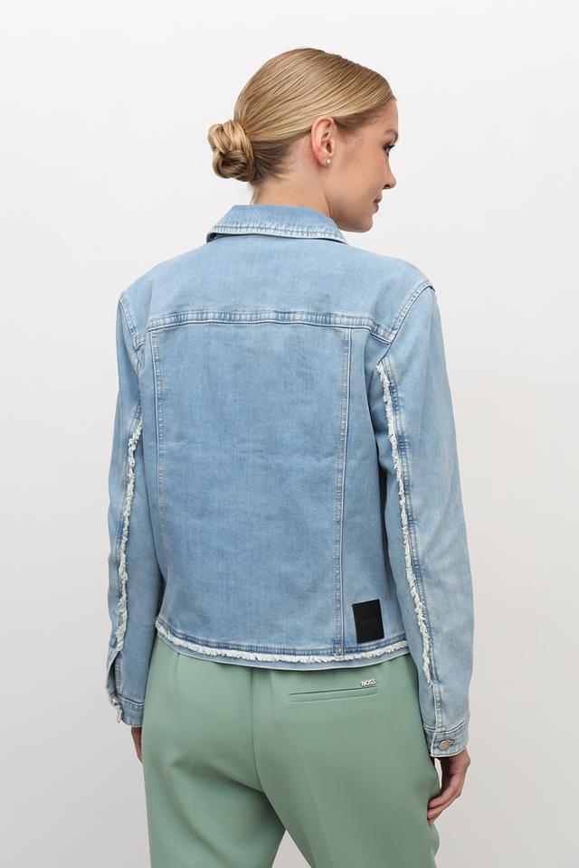 Жакет имеет классический крой, длинные рукава и застежку на пуговицы. Отделка краев рукавов и низа изделия выполнена в виде необработанной бахромы, что придает жакету более расслабленный и современный вид.