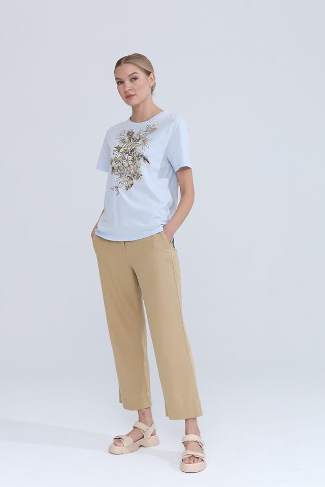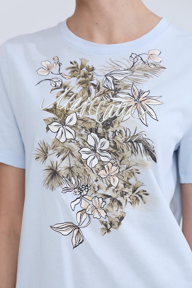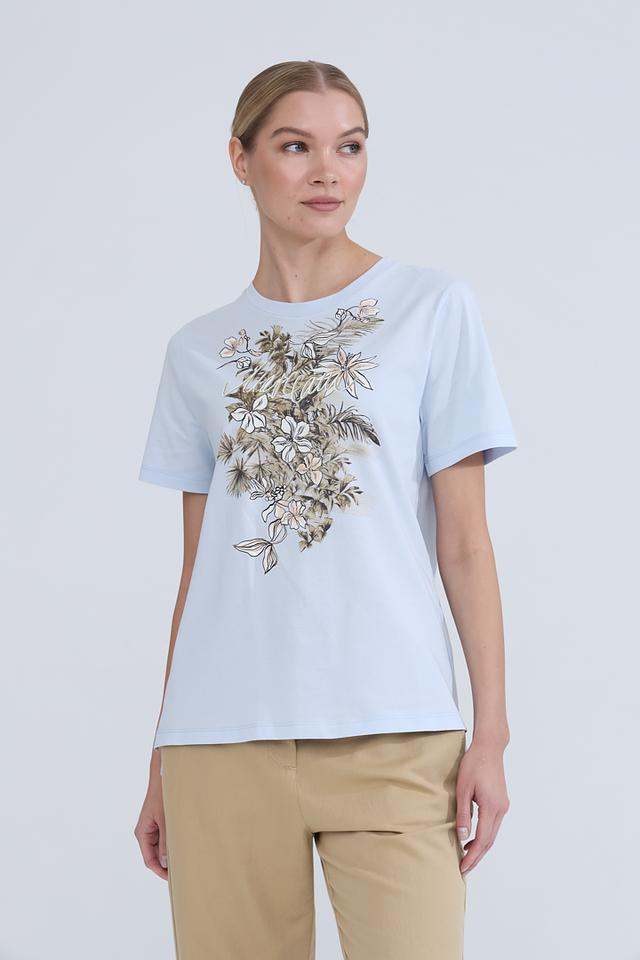 Женская футболка Marc Cain светло-голубого цвета украшена ярким цветочным принтом. Изготовлена из 100% хлопка, обеспечивая комфорт и воздухопроницаемость. Стильный и удобный вариант для повседневного образа. Состав: хлопок 100%