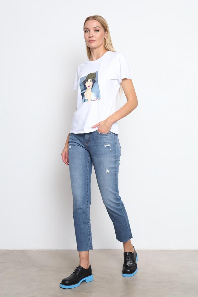 Джинсы отличаются оригинальным дизайном с потертостями и декоративными вышивками, добавляющими образу непринужденности и индивидуальности. Высокая посадка обеспечивает комфортную посадку и подчеркивает талию.
