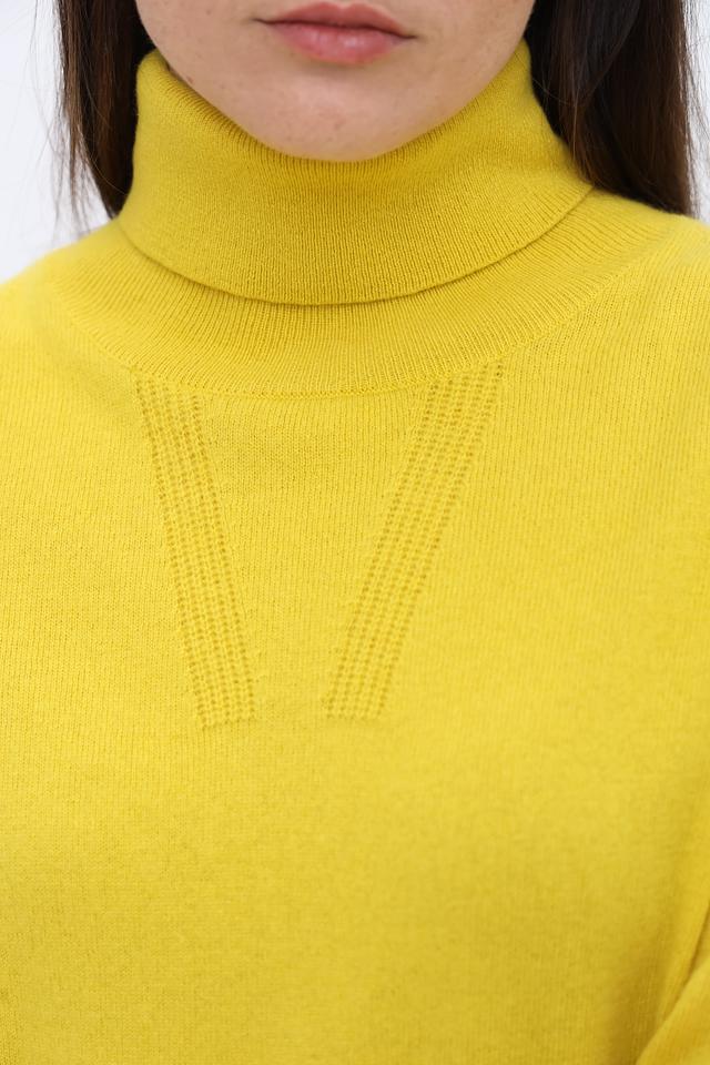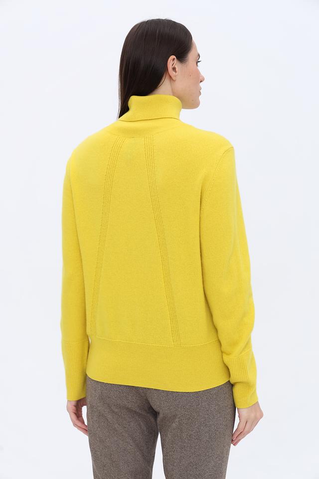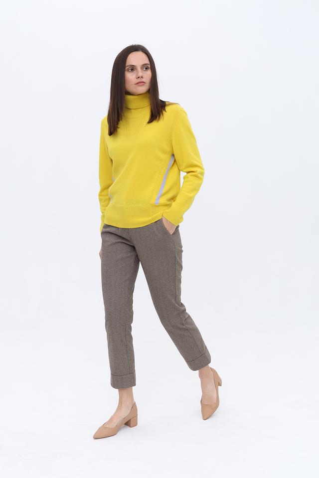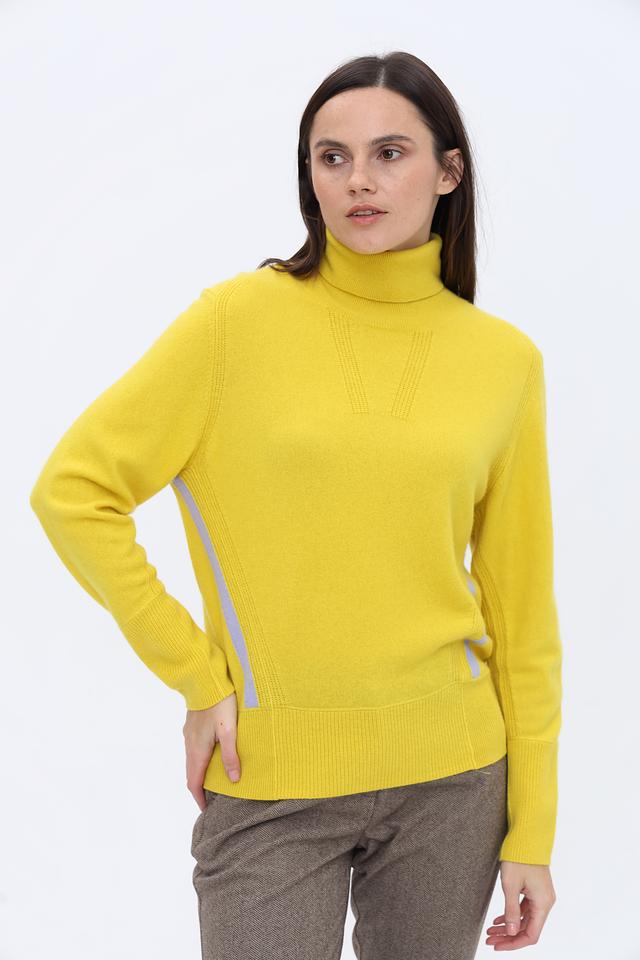 Пуловер имеет классический крой с высоким горлом, который подчеркивает элегантность силуэта. Яркий жёлтый цвет добавит свежести и позитива в ваш гардероб. Декоративные серые полоски на плечах и груди придают модели оригинальность и динамичный вид.