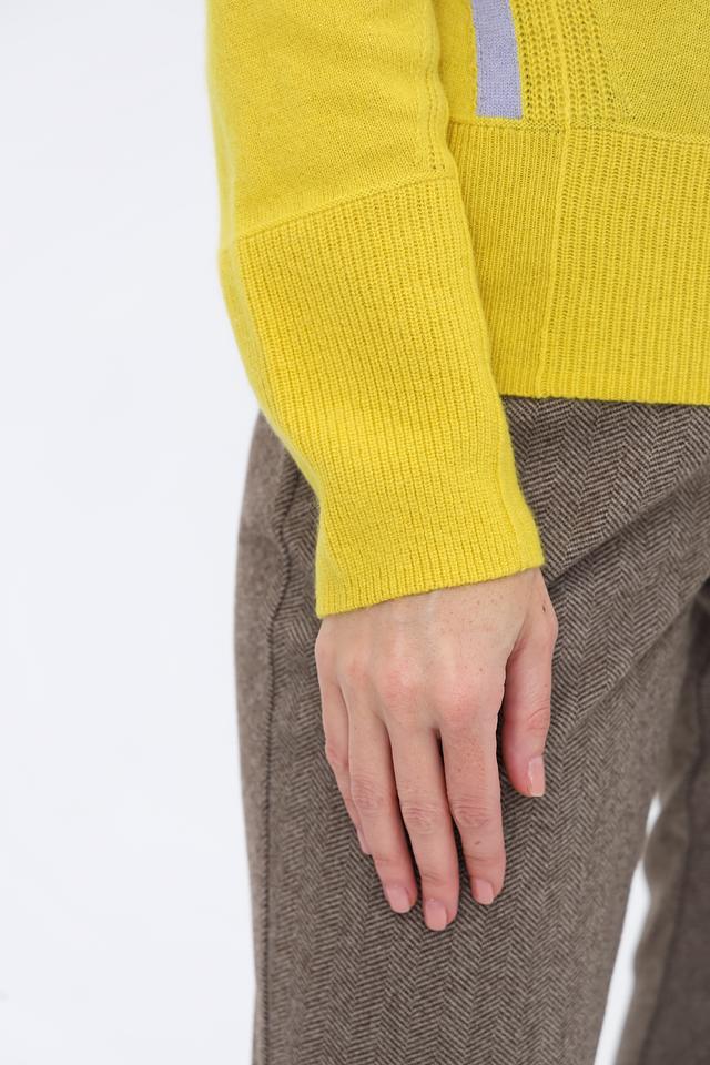 Жёлтый пуловер Marc Cain из шерсти и кашемира с декоративными полосками. Модель выполнена из высококачественного трикотажа с высоким горлом и имеет стильный, современный дизайн. Состав: шерсть 90%, кашемир 10%