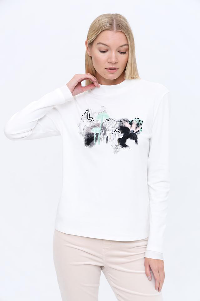 Белый лонгслив Marc Cain с оригинальным принтом на лицевой стороне. Изготовлен из 100% хлопка, обеспечивающего комфорт и воздухопроницаемость. Идеально подходит для создания стильного повседневного образа. Состав: хлопок 100%