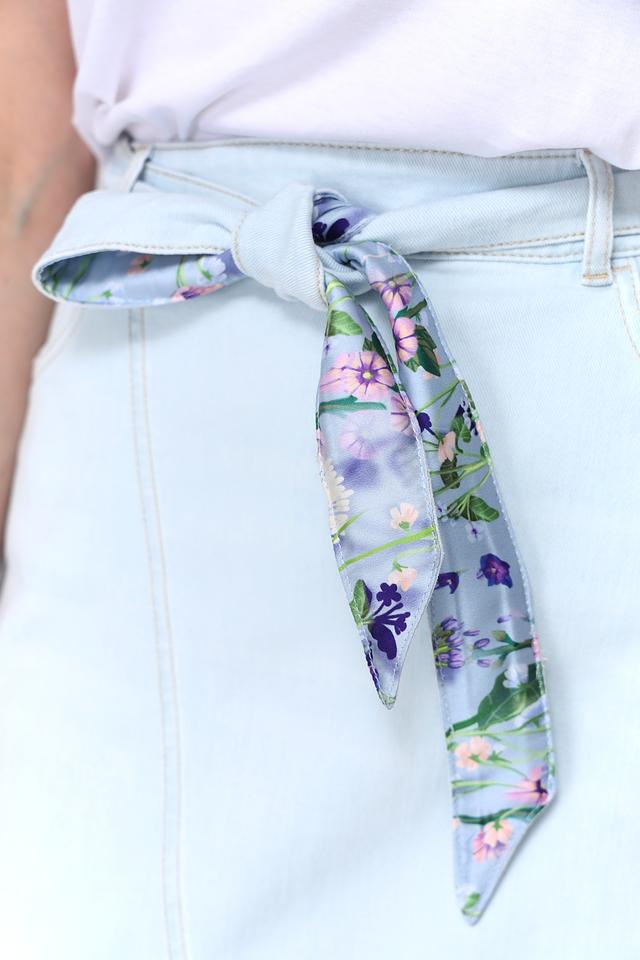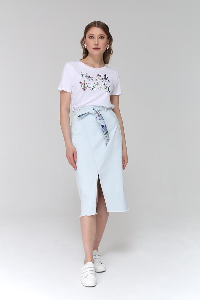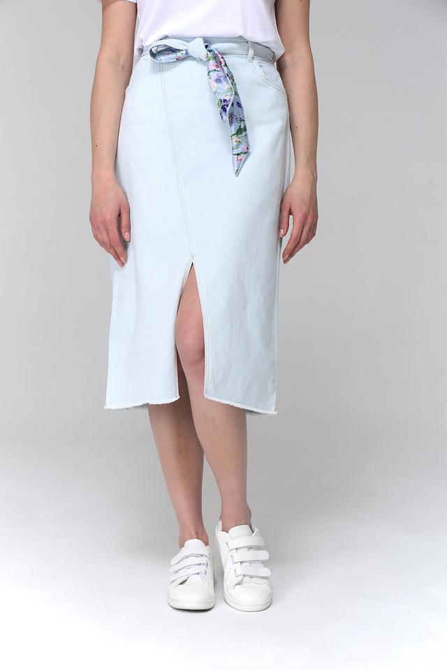 Юбка имеет классический крой с разрезом спереди, что придает ей современный вид. Пояс в цветочный принт добавляет образу женственности и оригинальности.