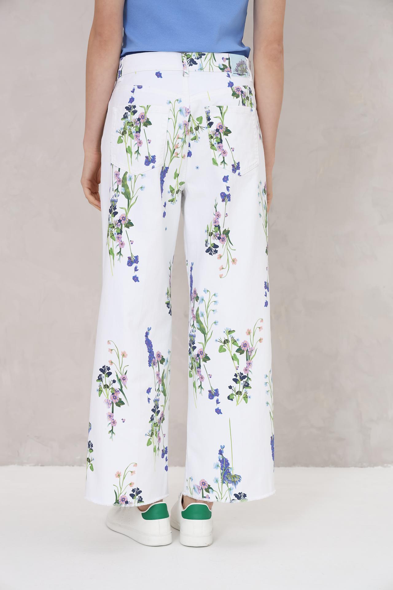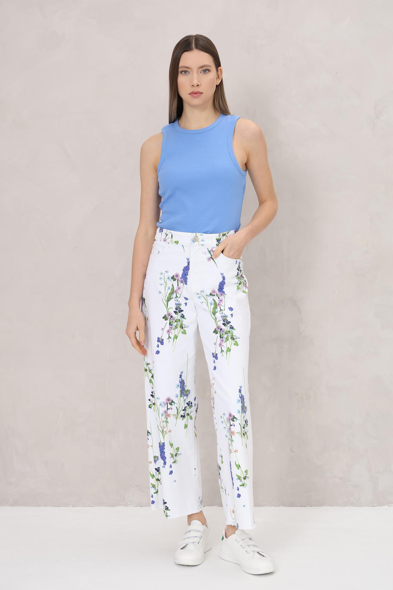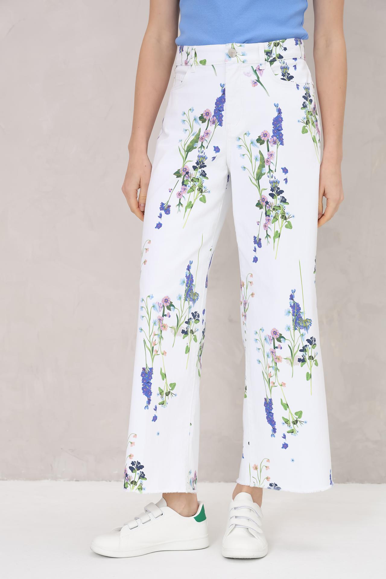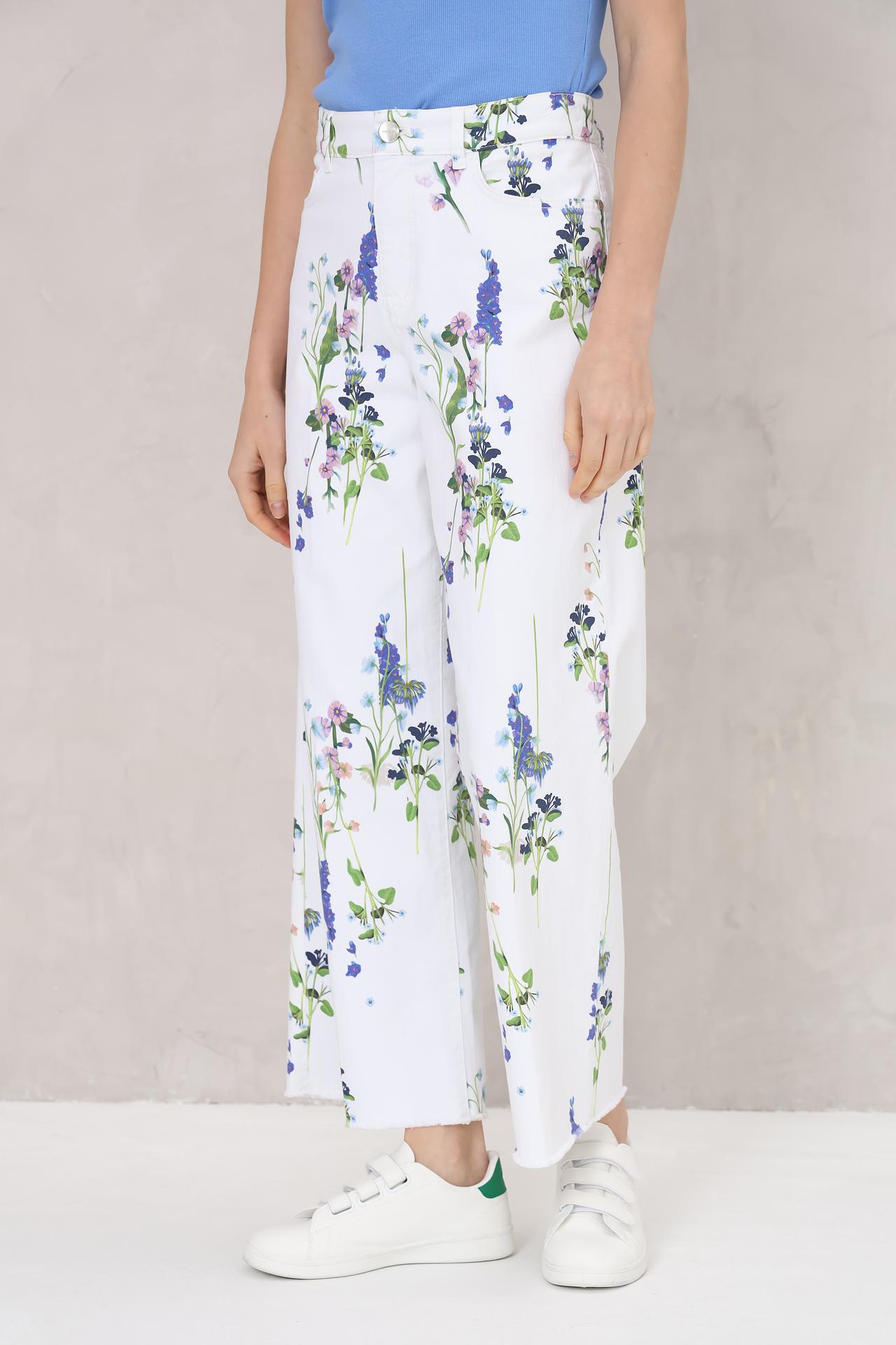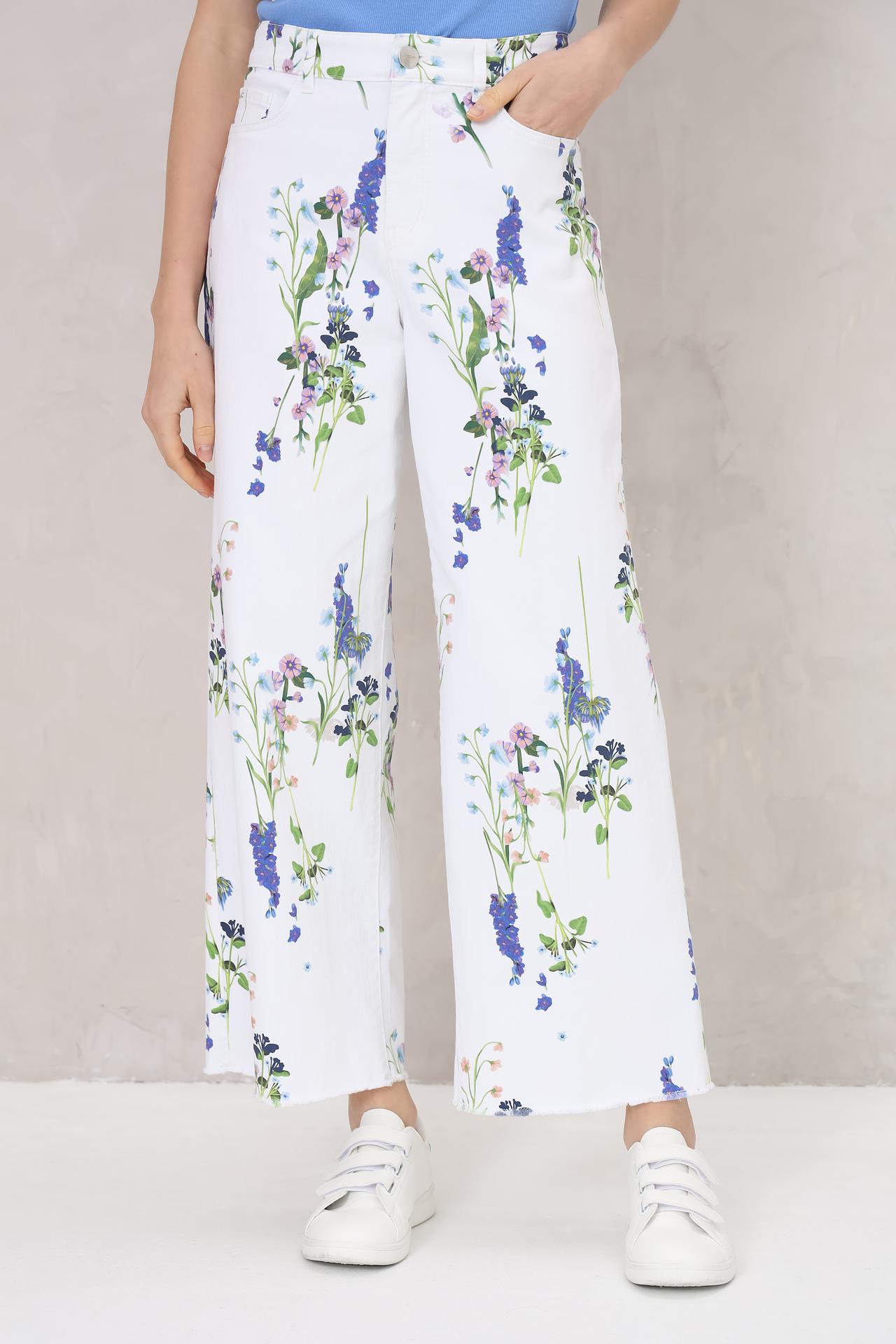 - Модный дизайн: Яркий цветочный принт на белом фоне придает джинсам неповторимый и свежий вид, делая их центральным элементом любого образа. Укороченные широкие штанины с необработанным краем подчеркивают актуальность модели.