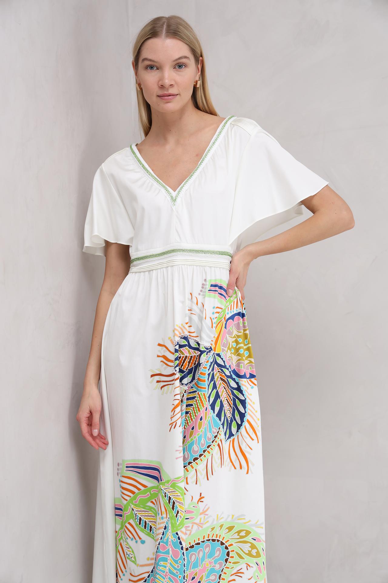 - Стильный дизайн: Элегантный крой midi, V-образный вырез и оригинальный цветочный принт создают женственный и современный образ.
