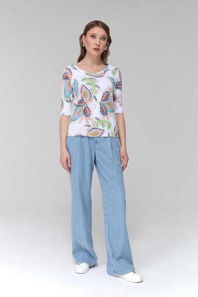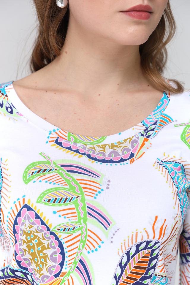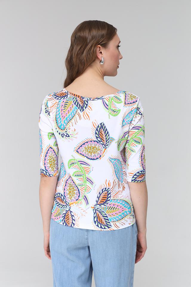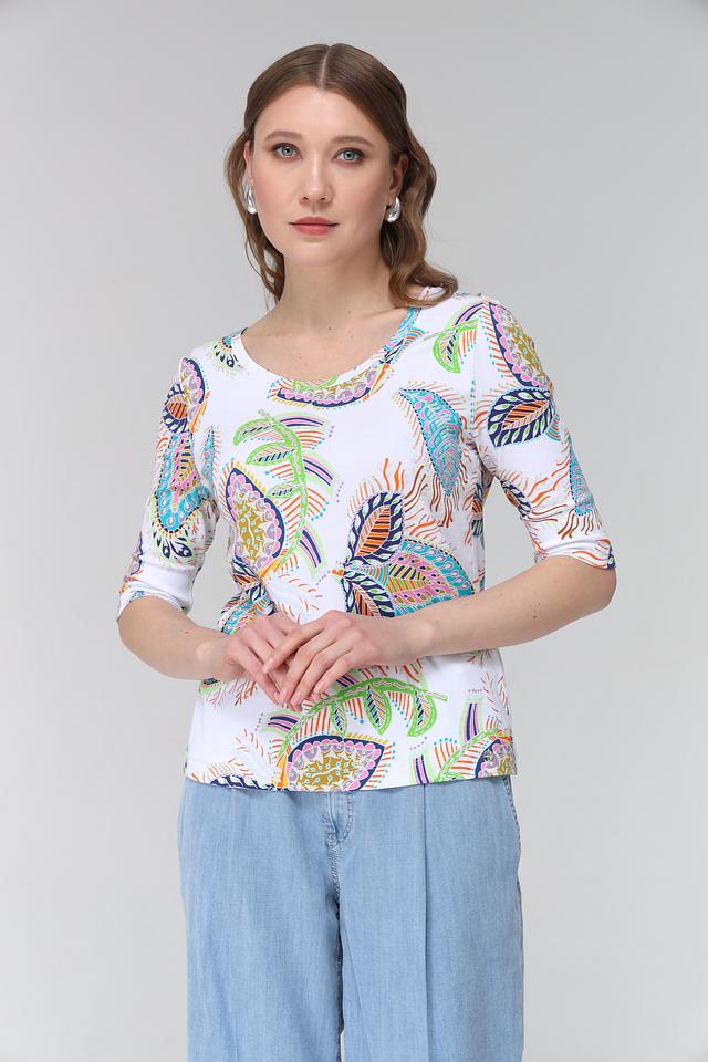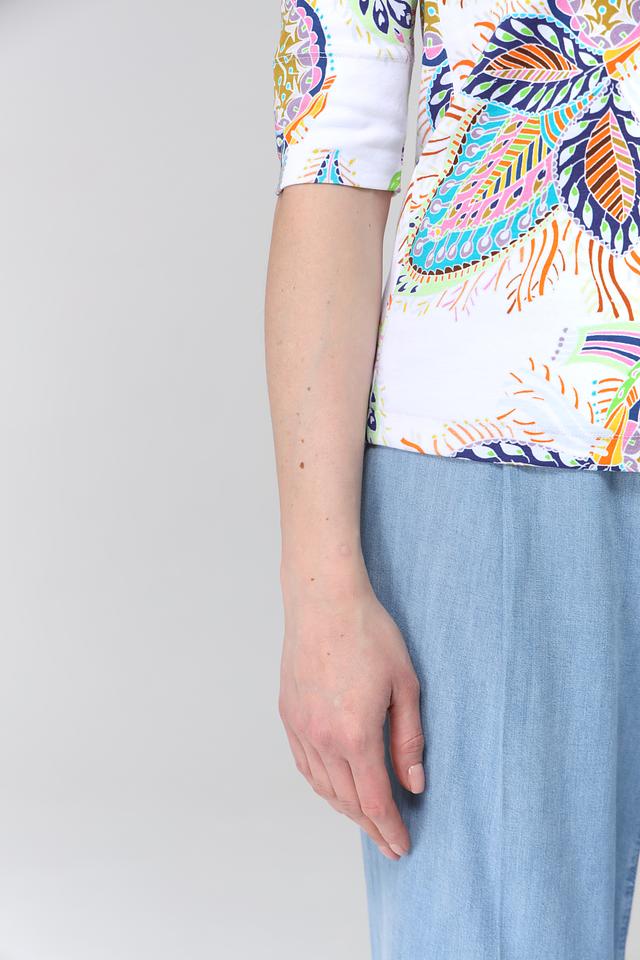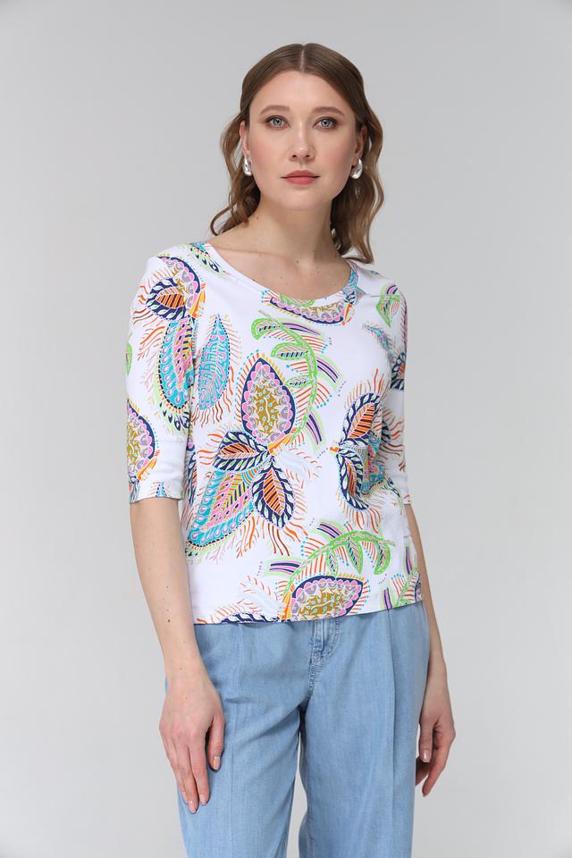 Эта футболка от Marc Cain станет ярким акцентом в вашем гардеробе. Выполнена в белом цвете и украшена оригинальным принтом, состоящим из разноцветных узоров, напоминающих листья и цветы.