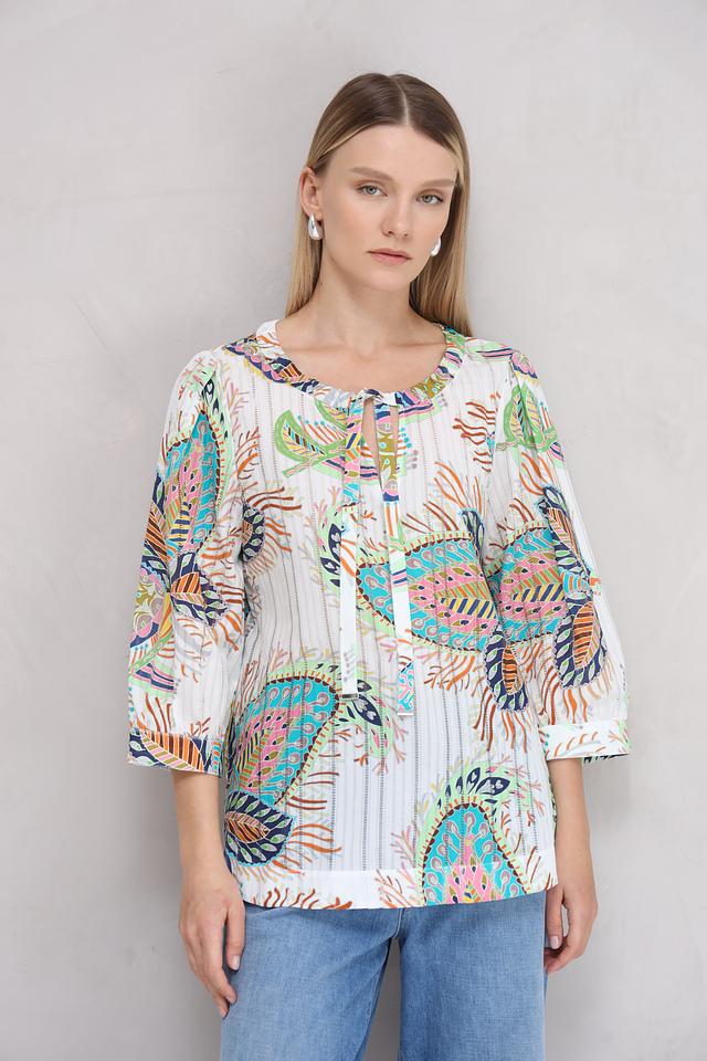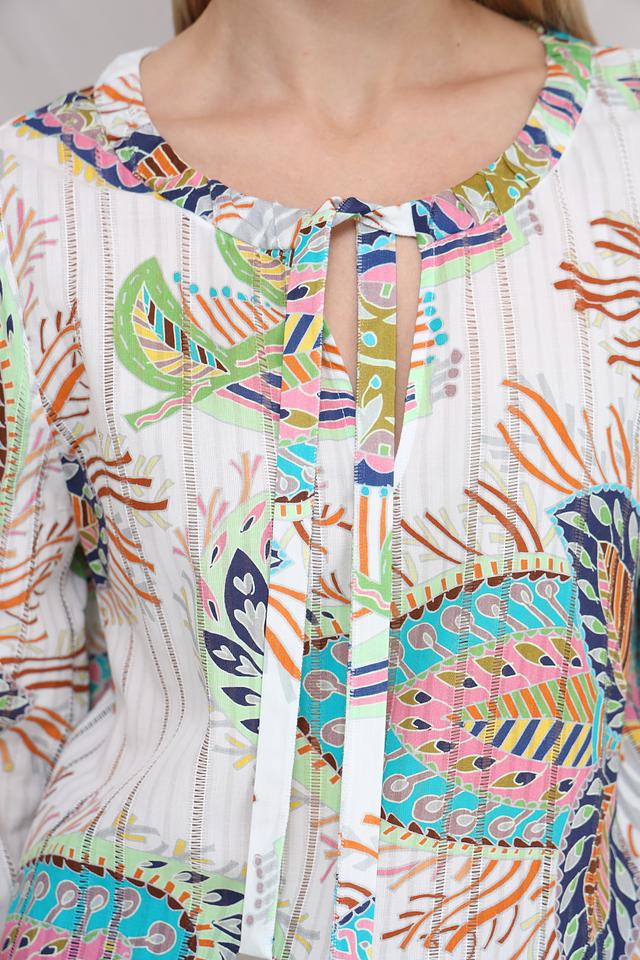 Белая блуза Marc Cain с ярким цветочным принтом и завязками на горловине. Модель выполнена из 100% хлопка, обеспечивая комфорт и воздухопроницаемость. Состав: хлопок 100%