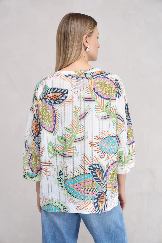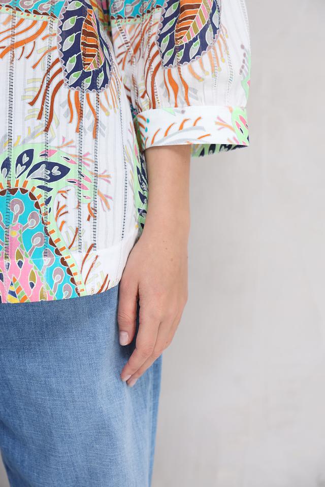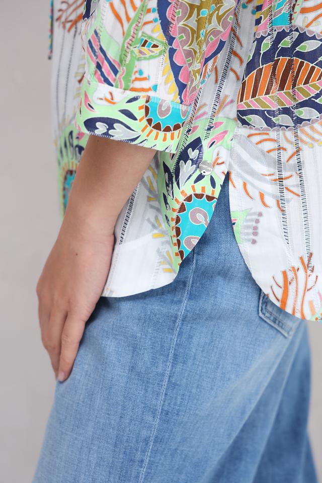 Эта стильная блуза от Marc Cain станет прекрасным дополнением к вашему гардеробу. Выполнена в белом цвете и украшена красочным цветочным принтом, который придает ей неповторимый вид.