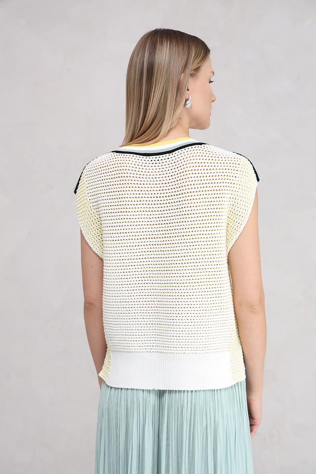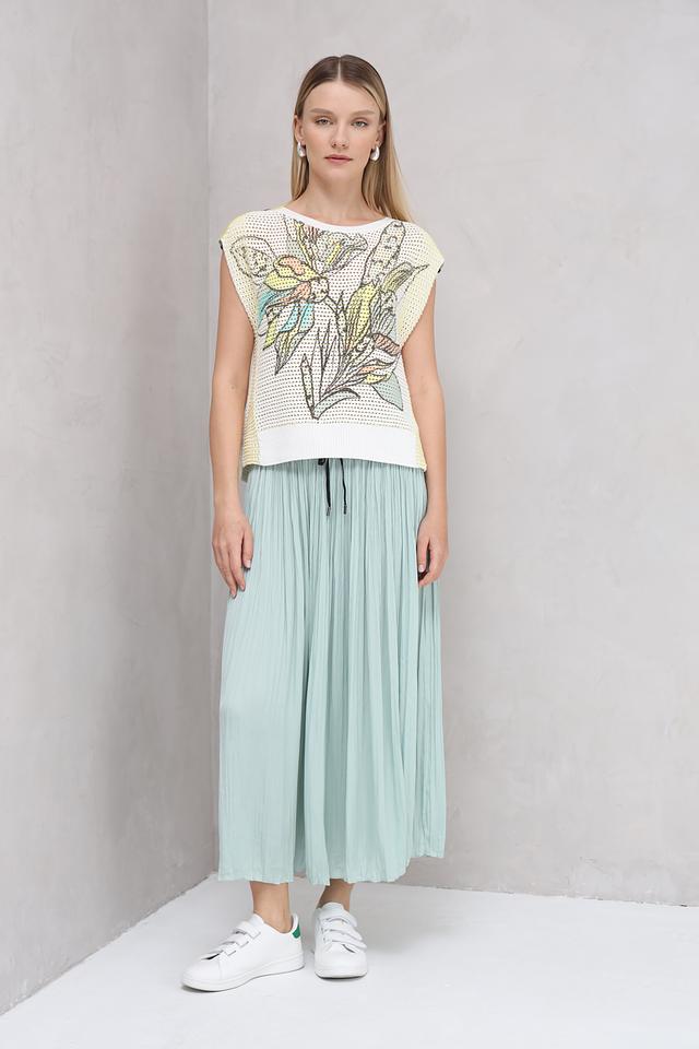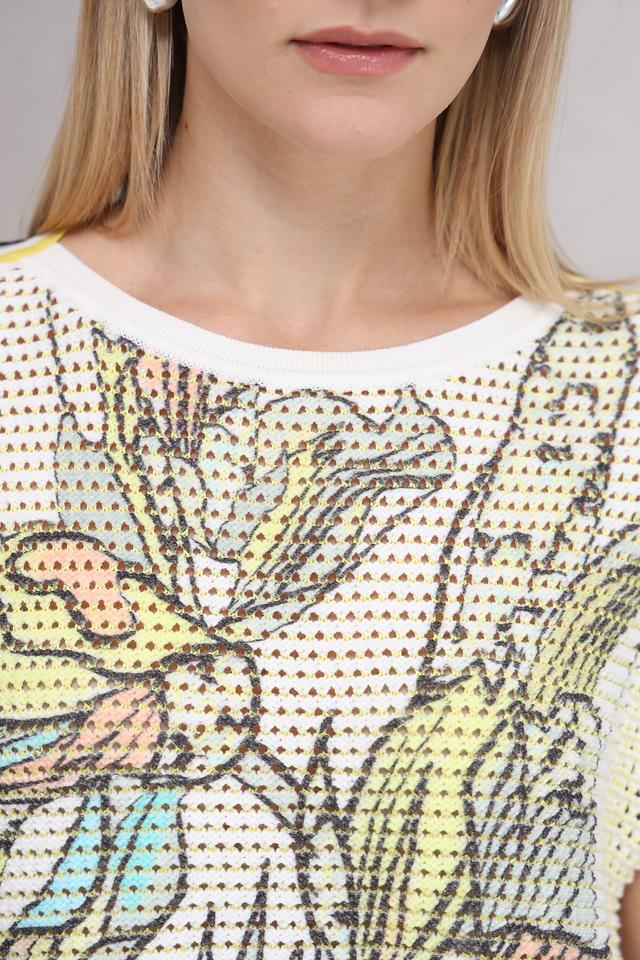 Топ имеет свободный крой и короткие рукава, что обеспечивает комфорт в жаркую погоду. Изготовлен из высококачественного трикотажа, состоящего из 62% хлопка, 21% полиамида и 17% полиэстера. Хлопок обеспечивает мягкость и воздухопроницаемость, а добавление полиамида и полиэстера придает изделию прочность и устойчивость к деформации.