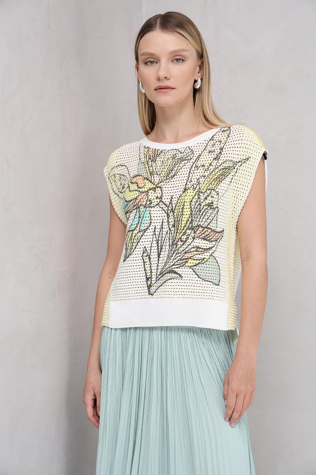 Этот элегантный топ от Marc Cain станет прекрасным дополнением к вашему образу. Выполнен в белом цвете и украшен оригинальным цветочным принтом, выполненным в нежных пастельных тонах.