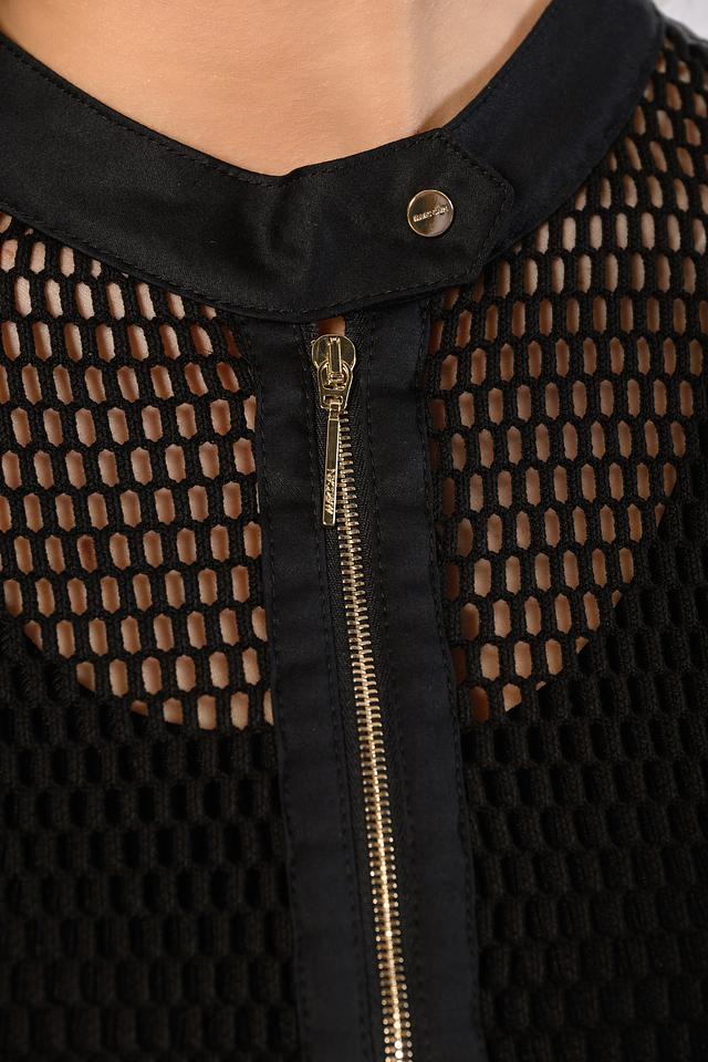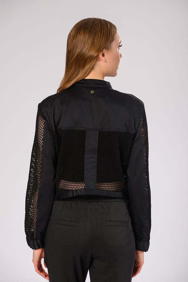 Особенностью модели является сетчатая текстура, которая придает жакету легкость и оригинальность. Застежка-молния позволяет регулировать степень прилегания, а воротник-стойка добавляет образу строгости. Жакет имеет длинные рукава и стандартную посадку.