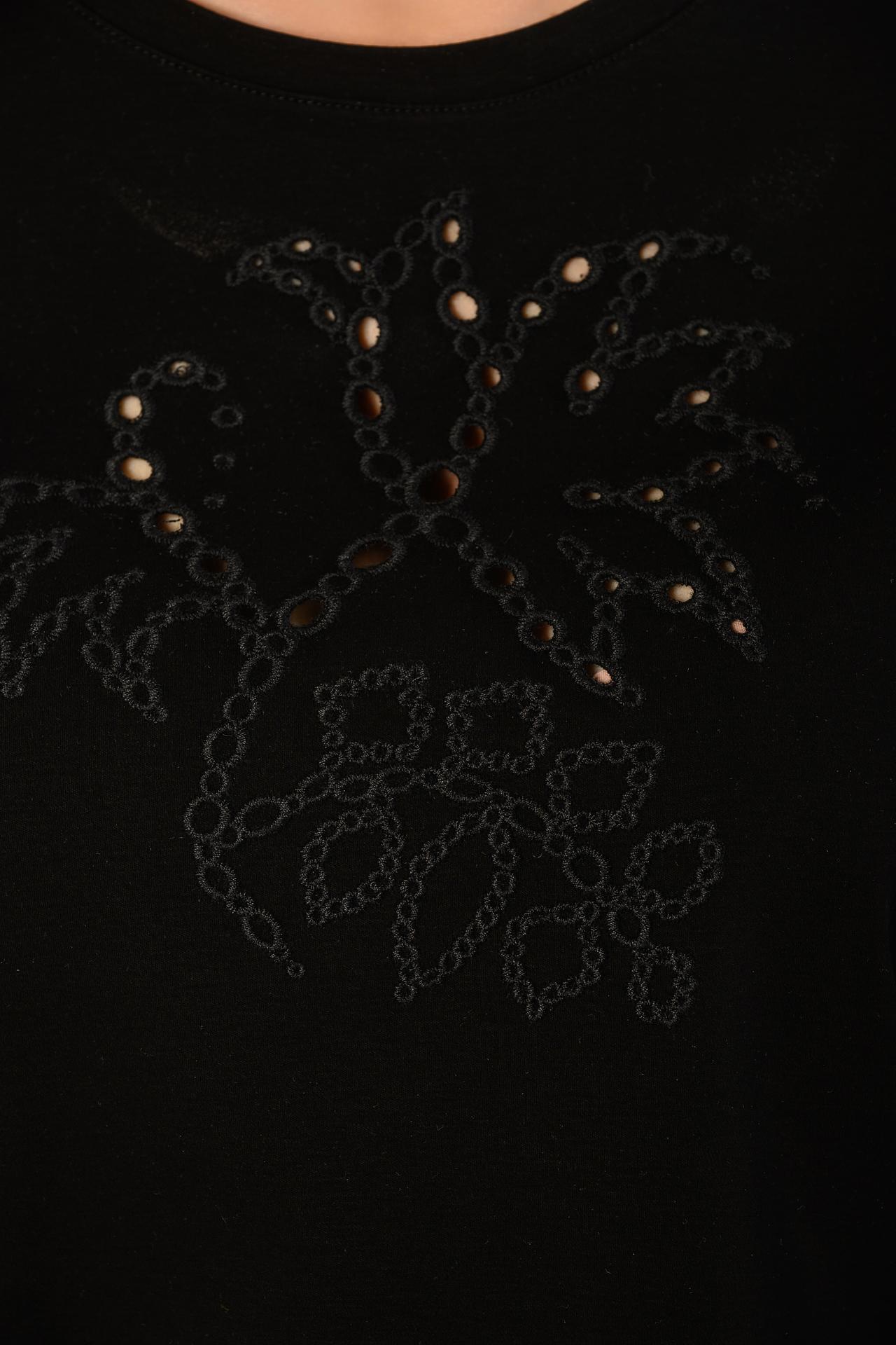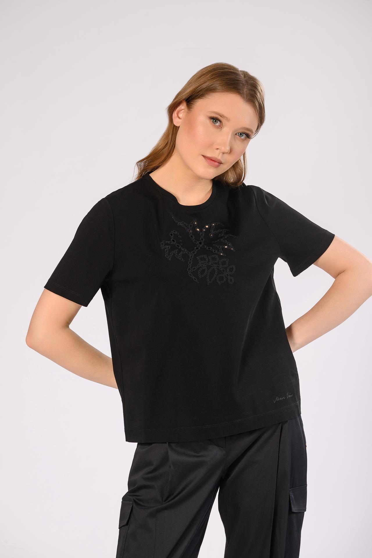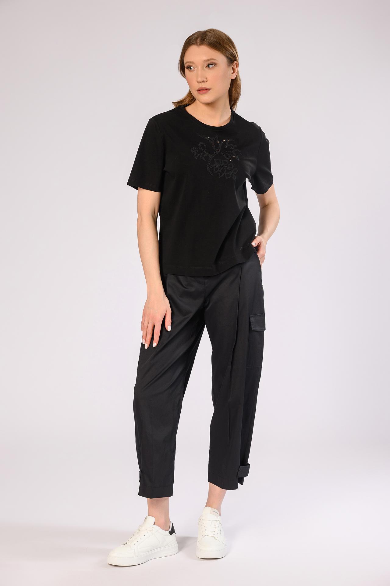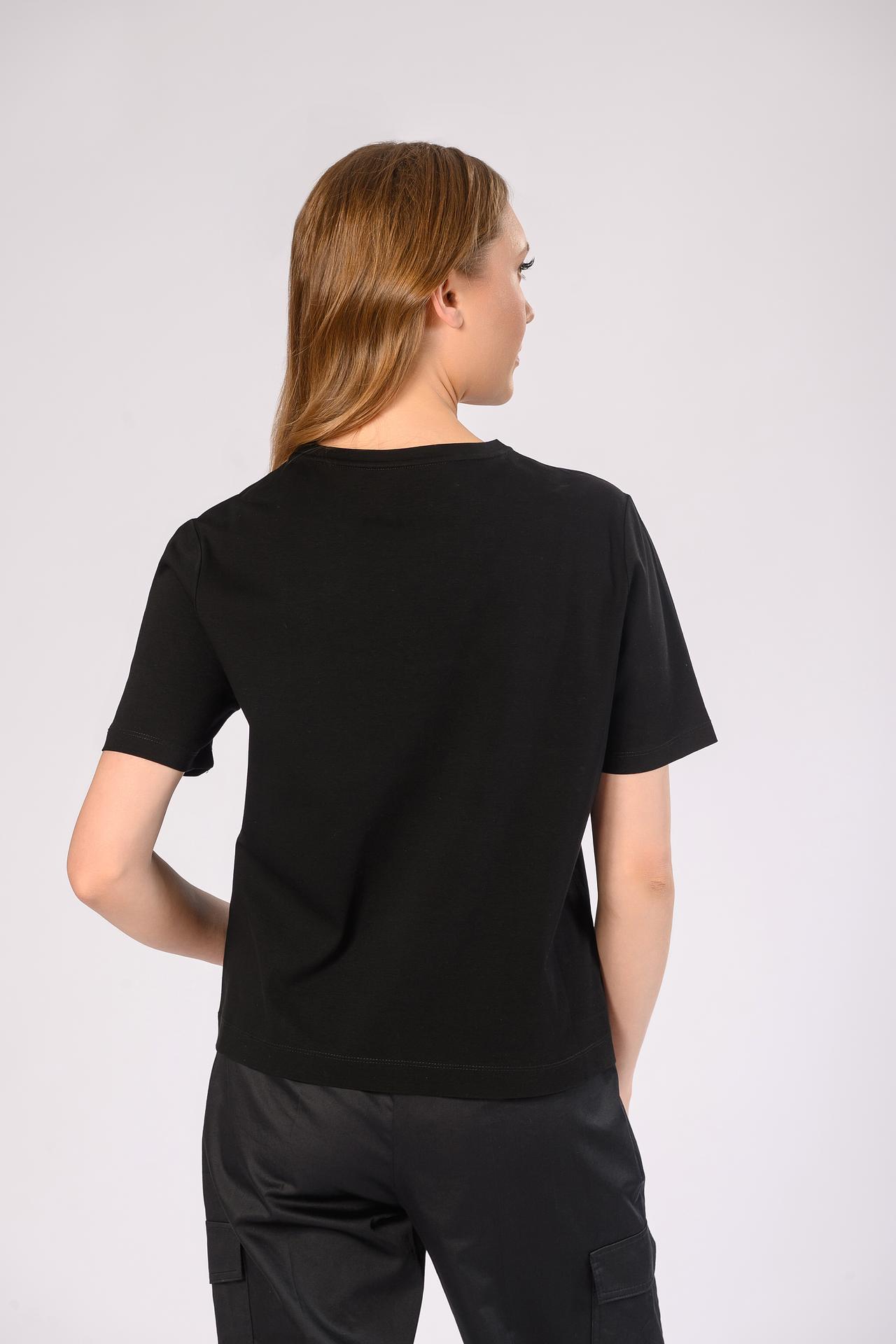 - Цвет: Универсальный черный цвет футболки позволяет легко сочетать ее с различными элементами гардероба. Глубокий черный оттенок подчеркивает элегантность и изысканность модели.