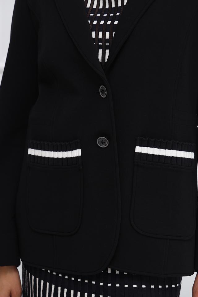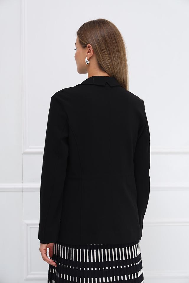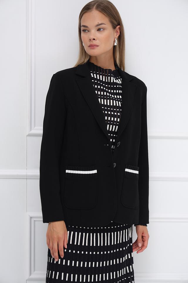Модель имеет приталенный силуэт, который подчеркивает достоинства фигуры. Длинные рукава и лацканы добавляют элегантности. Застежка на пуговицах обеспечивает надежную фиксацию. Декоративные полосы на карманах придают жакету особый шарм и индивидуальность.