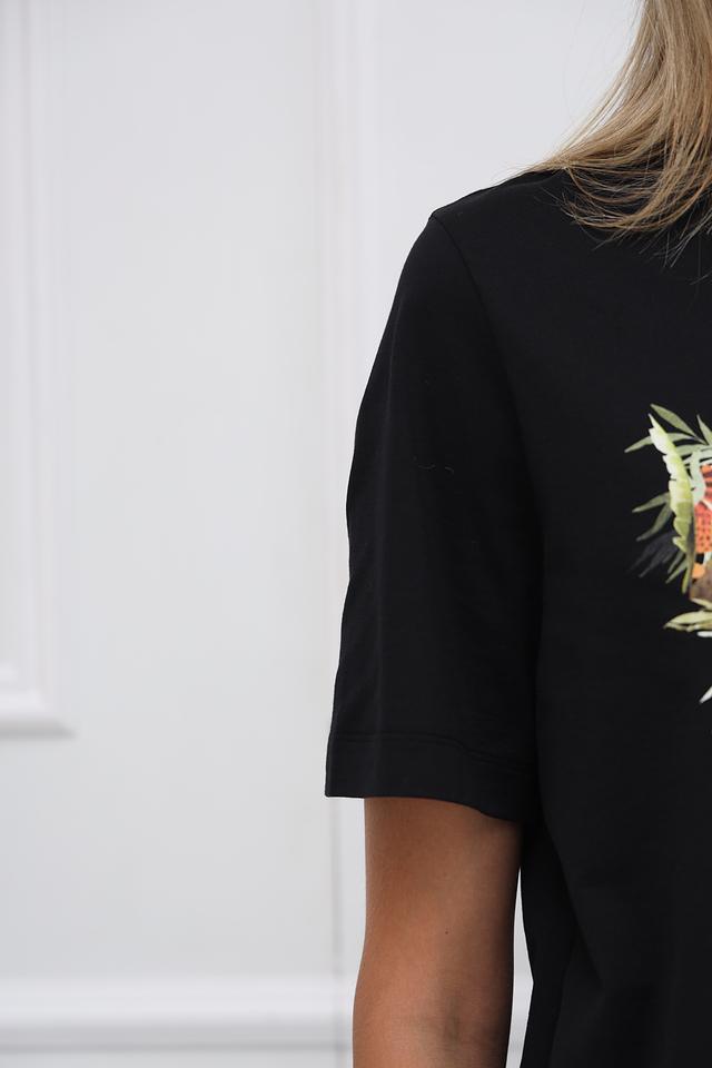 Особенностью данной модели является яркий и красочный принт с изображением тропических растений и леопардовых пятен. Принт выполнен в разнообразной цветовой гамме, включая зелёный, жёлтый, оранжевый и коричневый оттенки, что делает футболку особенно привлекательной.