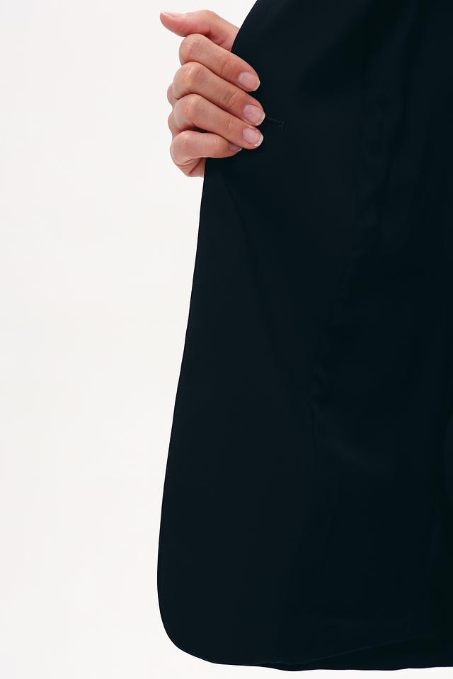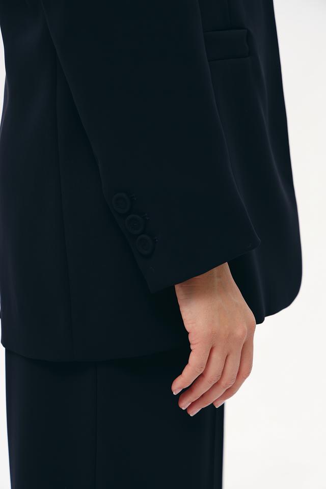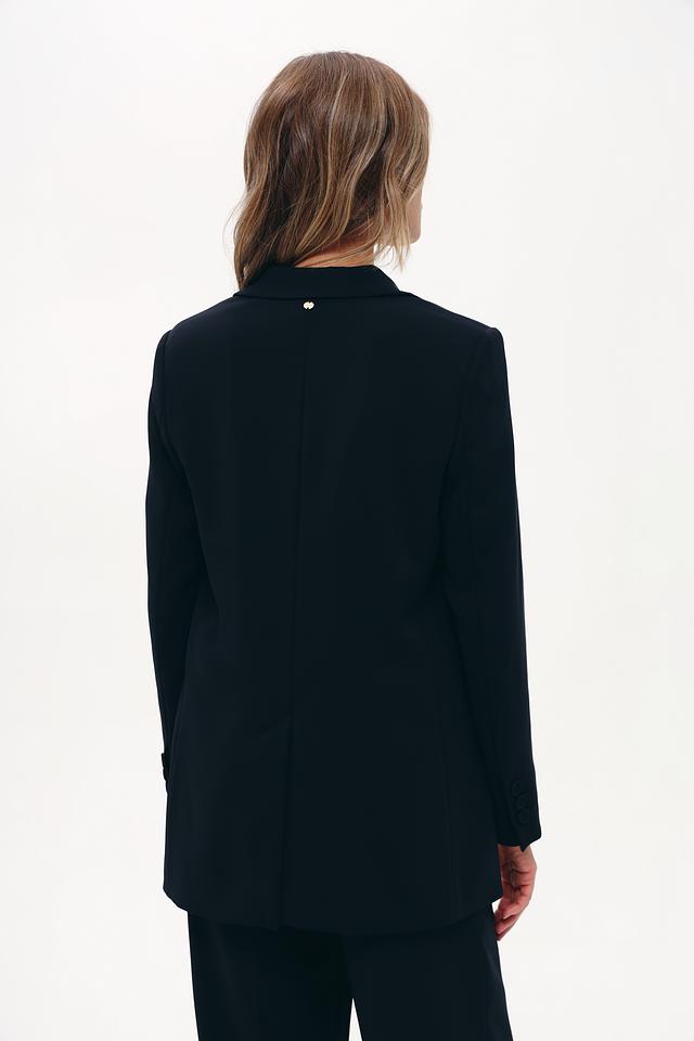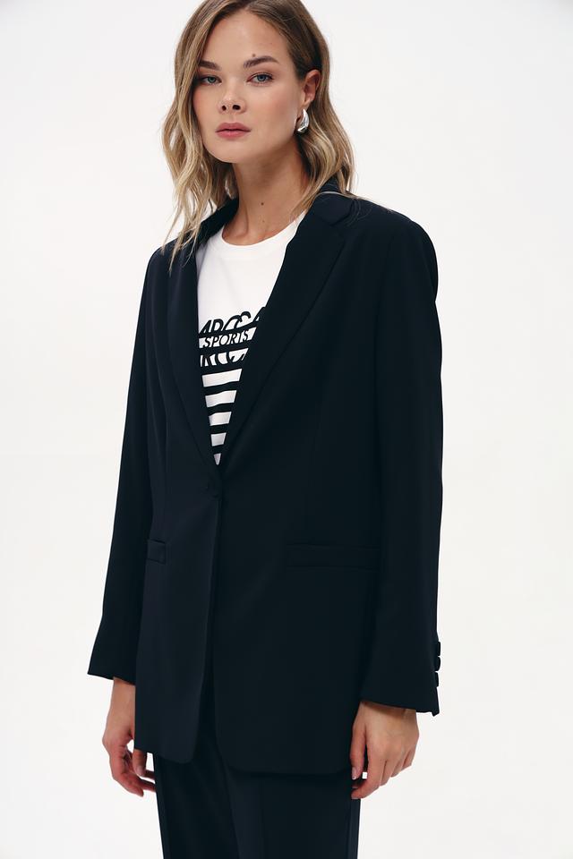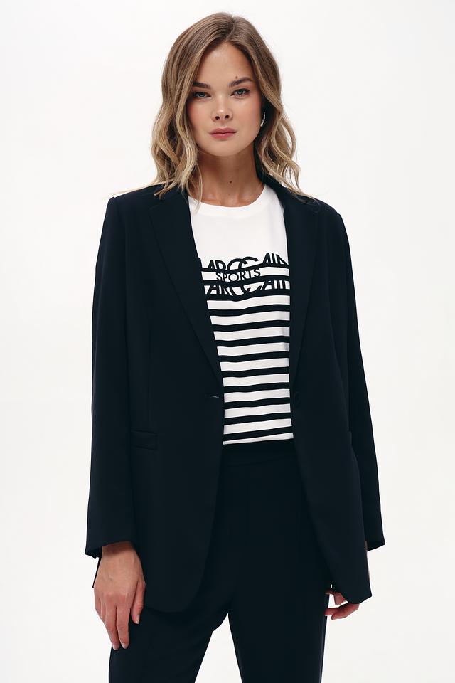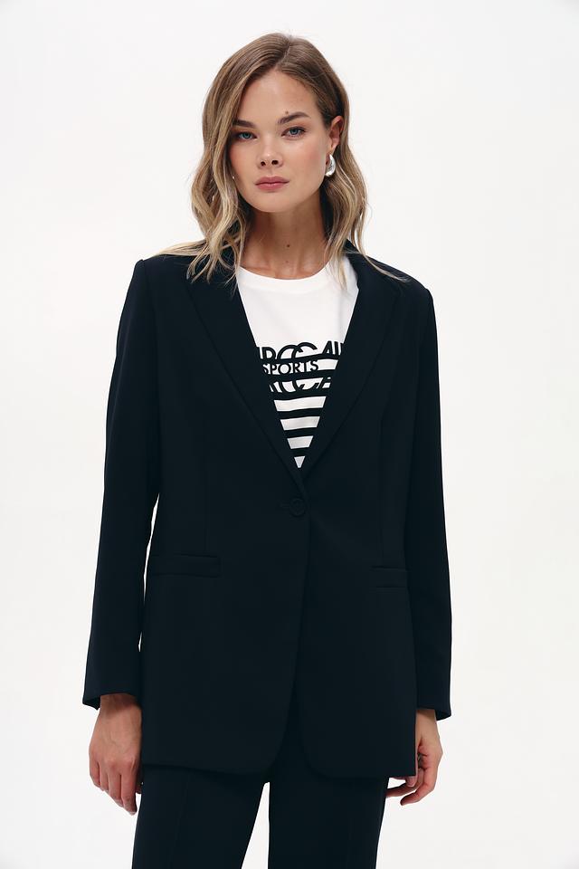 Жакет выполнен из высококачественного полиэстера (97%) с добавлением эластана (3%), что обеспечивает приятные тактильные ощущения, устойчивость к сминанию и отличную посадку по фигуре. Прямой крой подчеркивает силуэт, а застежка на одну пуговицу добавляет элегантности.