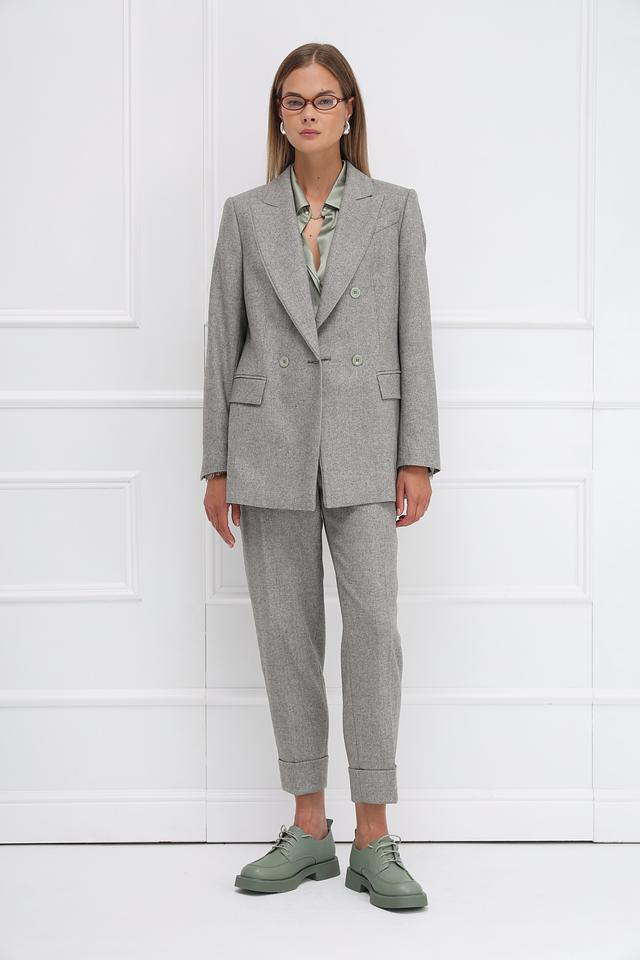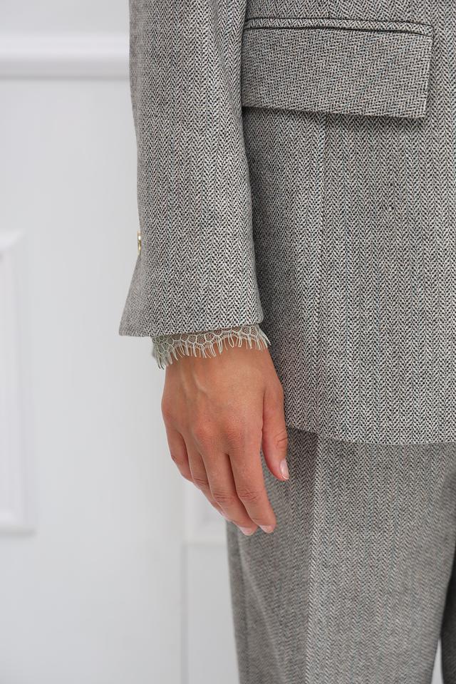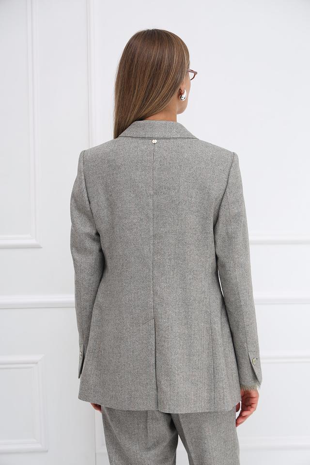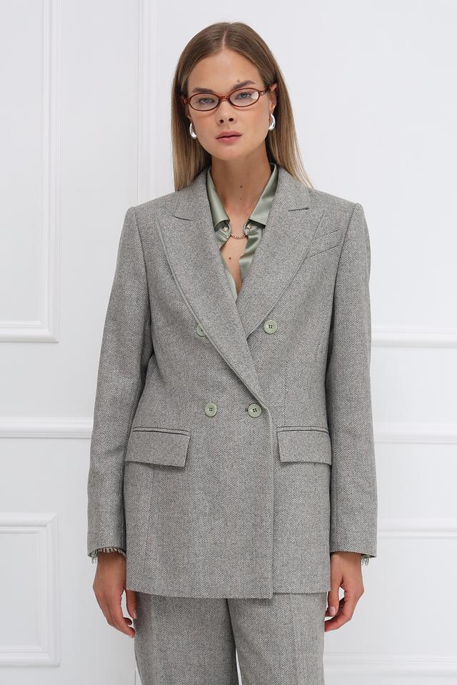 Жакет имеет двубортную застёжку на пуговицы, лацканы стандартной ширины и длинные рукава. Ткань жакета – это сочетание шерсти, акрила, полиэстера, полиамида и других волокон, что обеспечивает приятные тактильные ощущения и практичность в уходе.