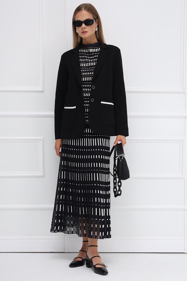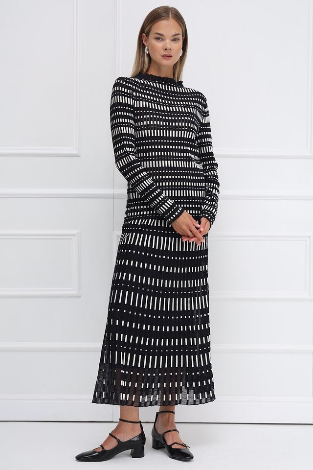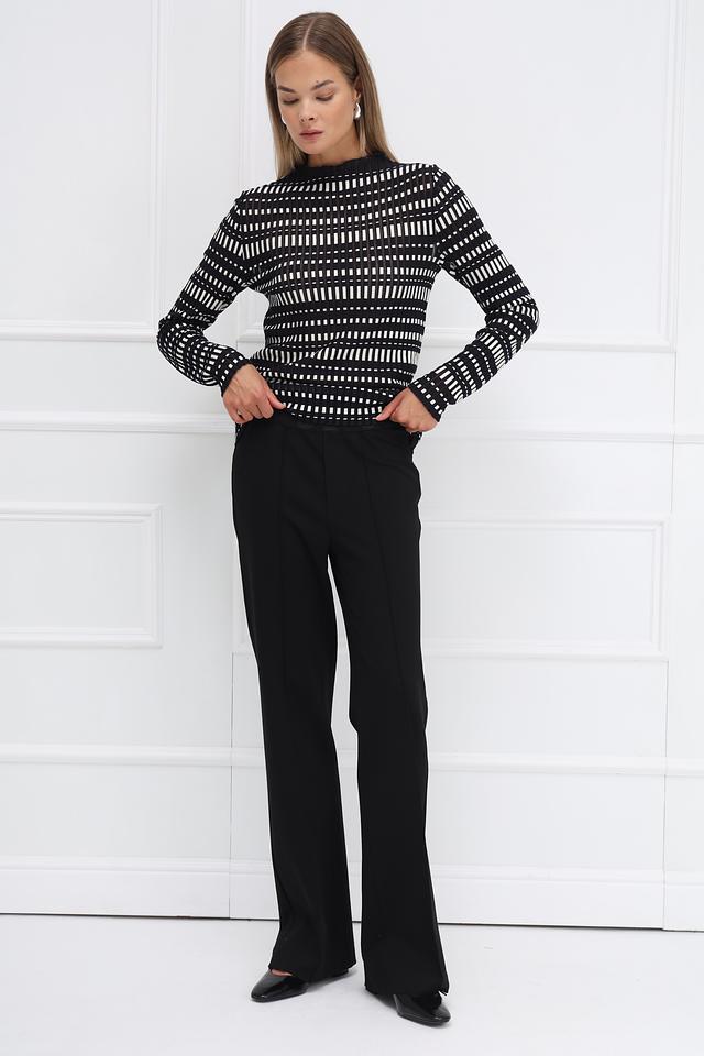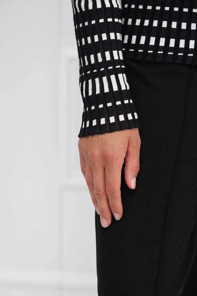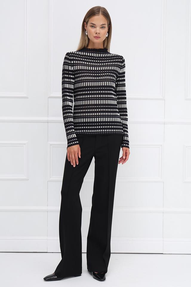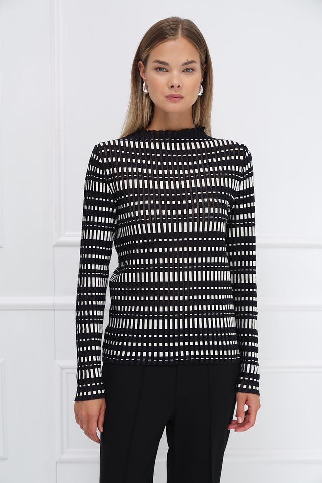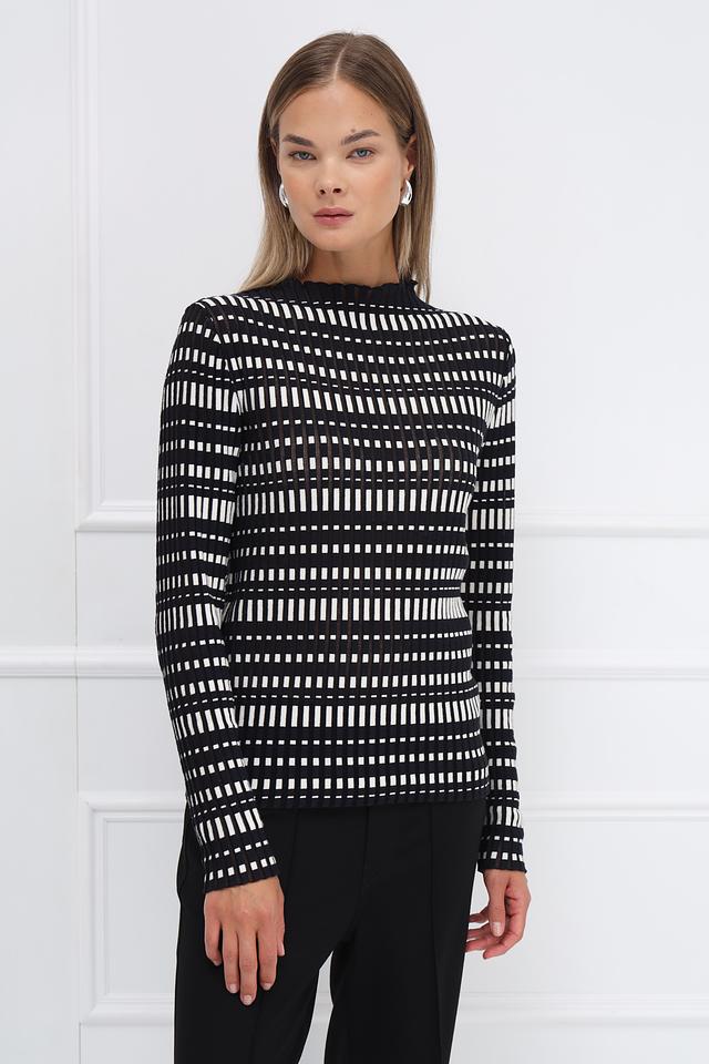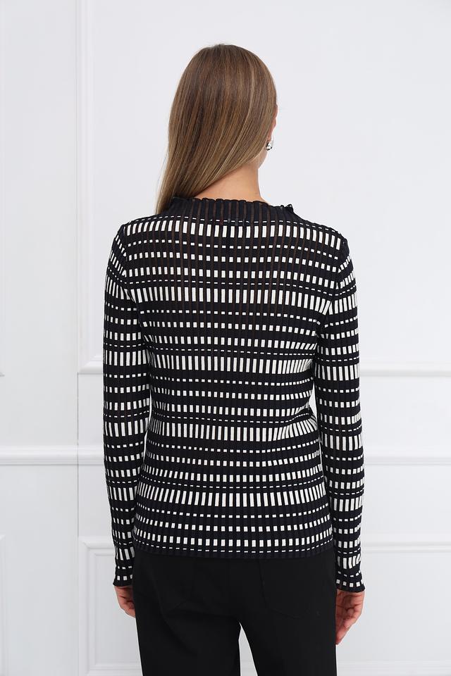 Основной цвет пуловера – чёрный, дополненный ярким геометрическим узором в белых тонах. Такое сочетание делает изделие универсальным и подходящим для различных случаев. Пуловер имеет слегка приталенный силуэт, который подчеркивает фигуру.