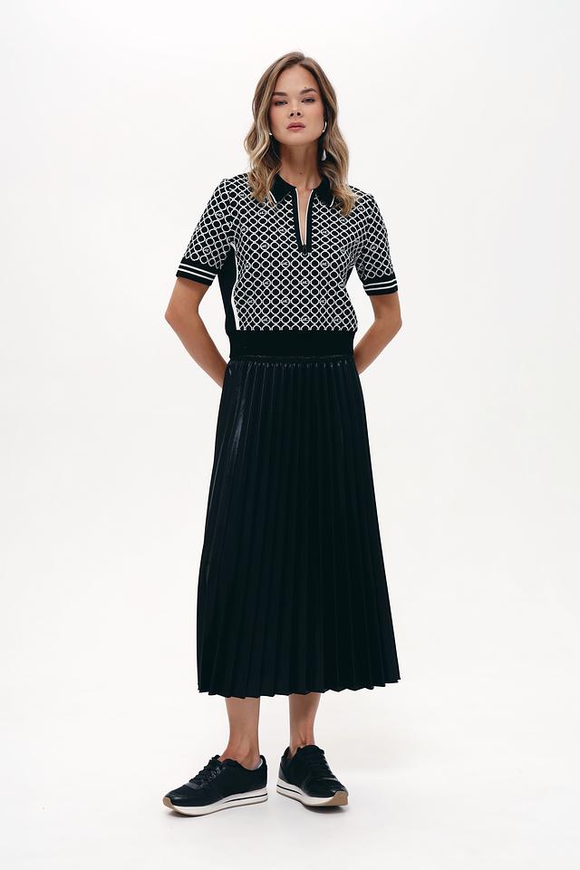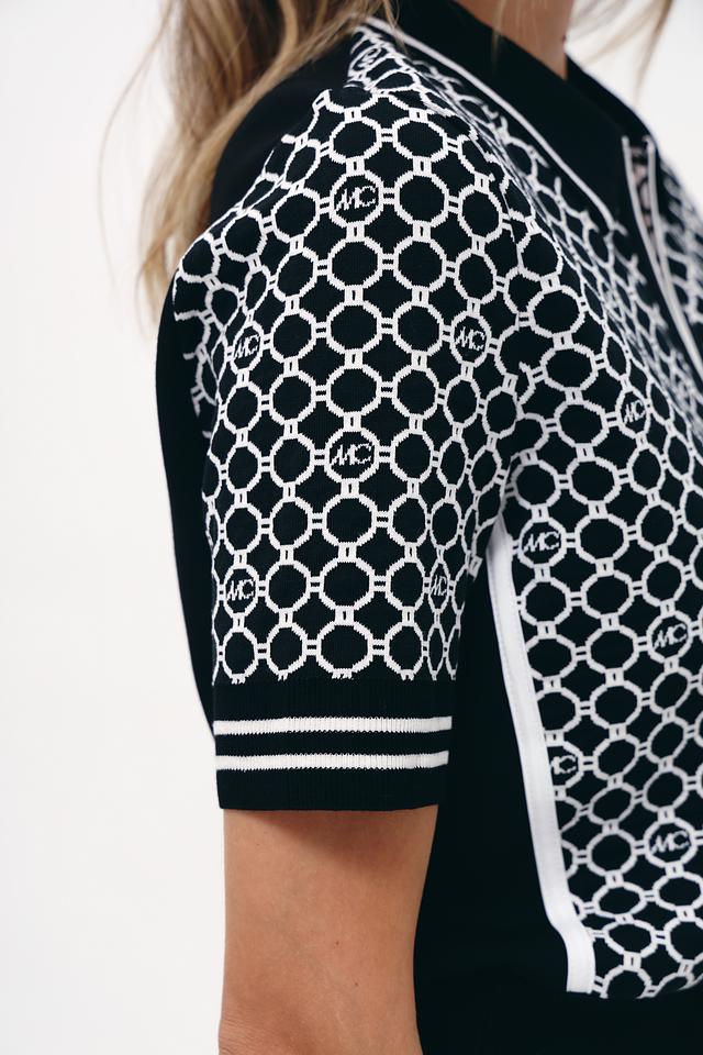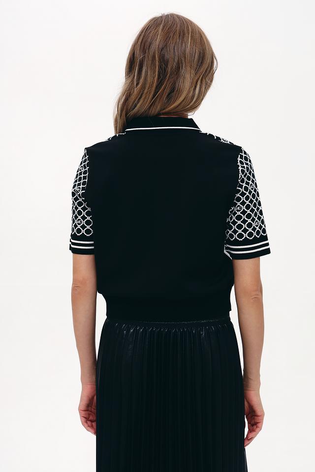 Модель имеет короткий рукав и классический воротник поло, который украшен повторяющимся логотипом бренда. Чёрный цвет пуловера делает его универсальным и легко сочетаемым с различными элементами одежды.