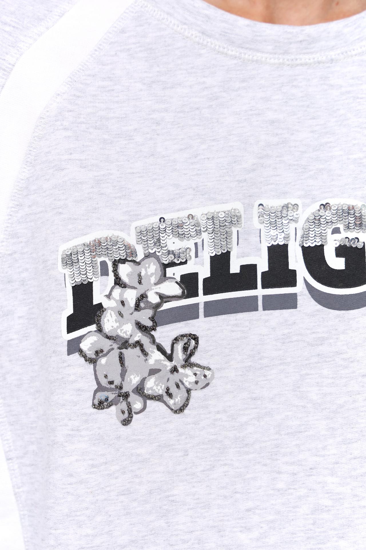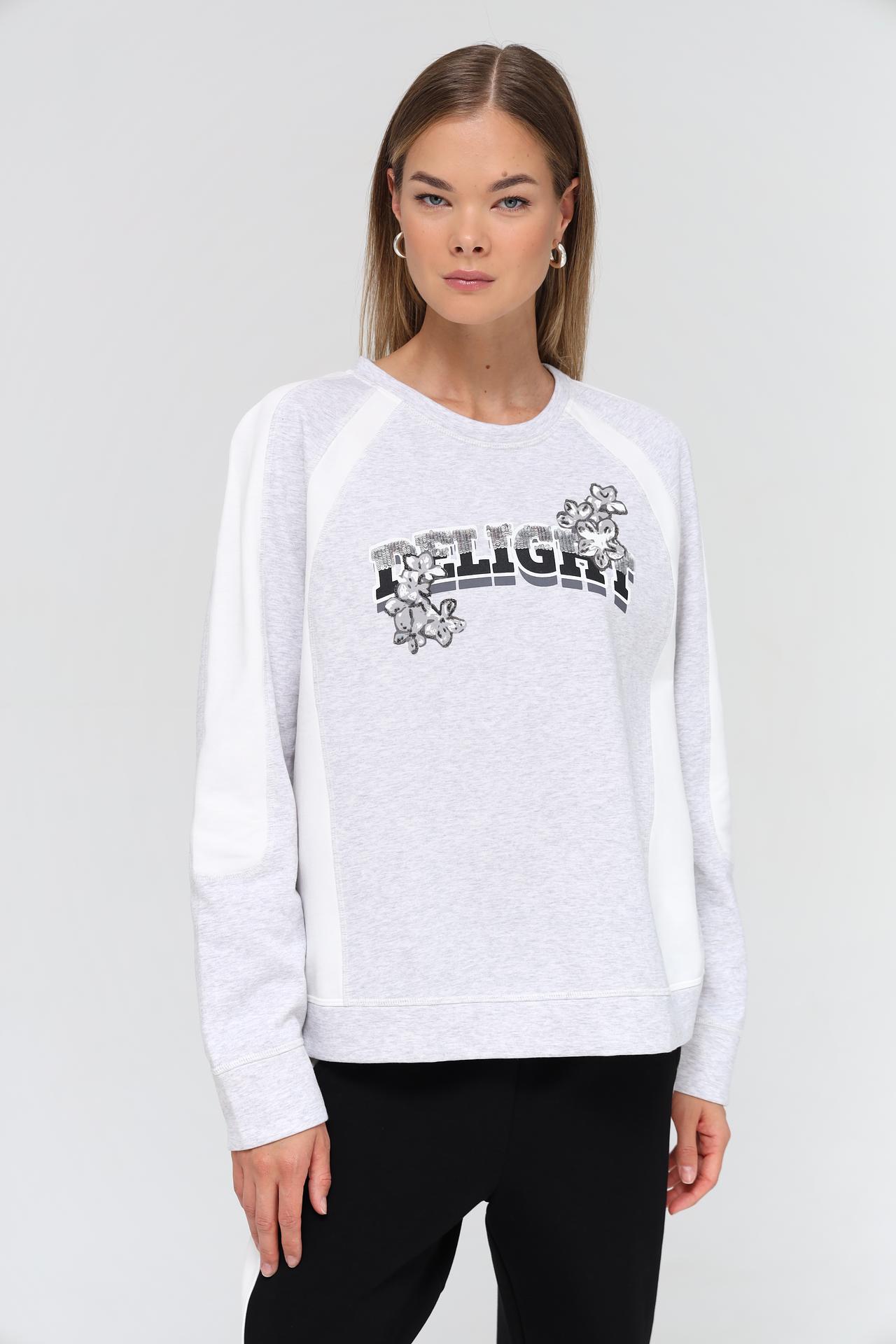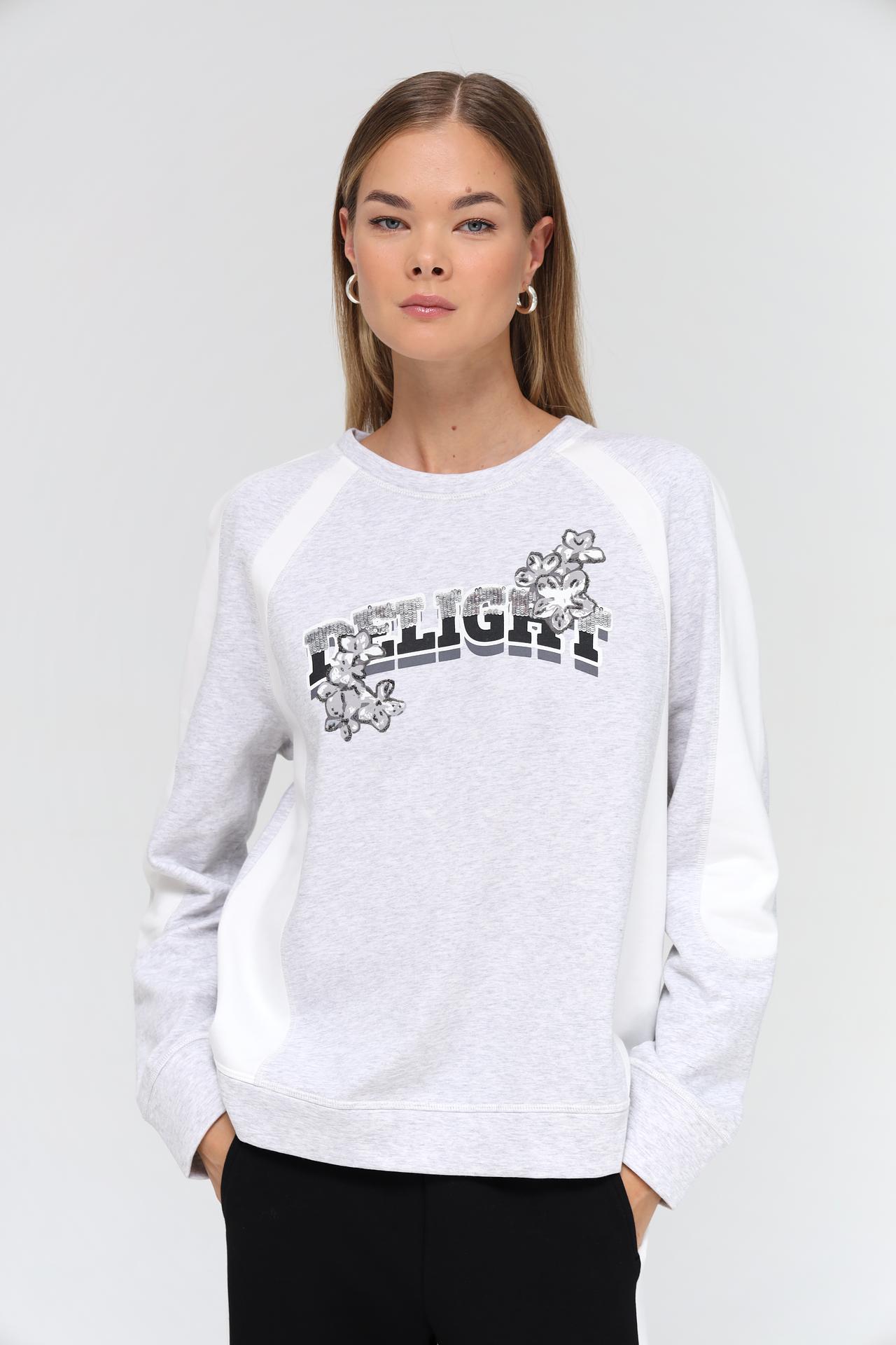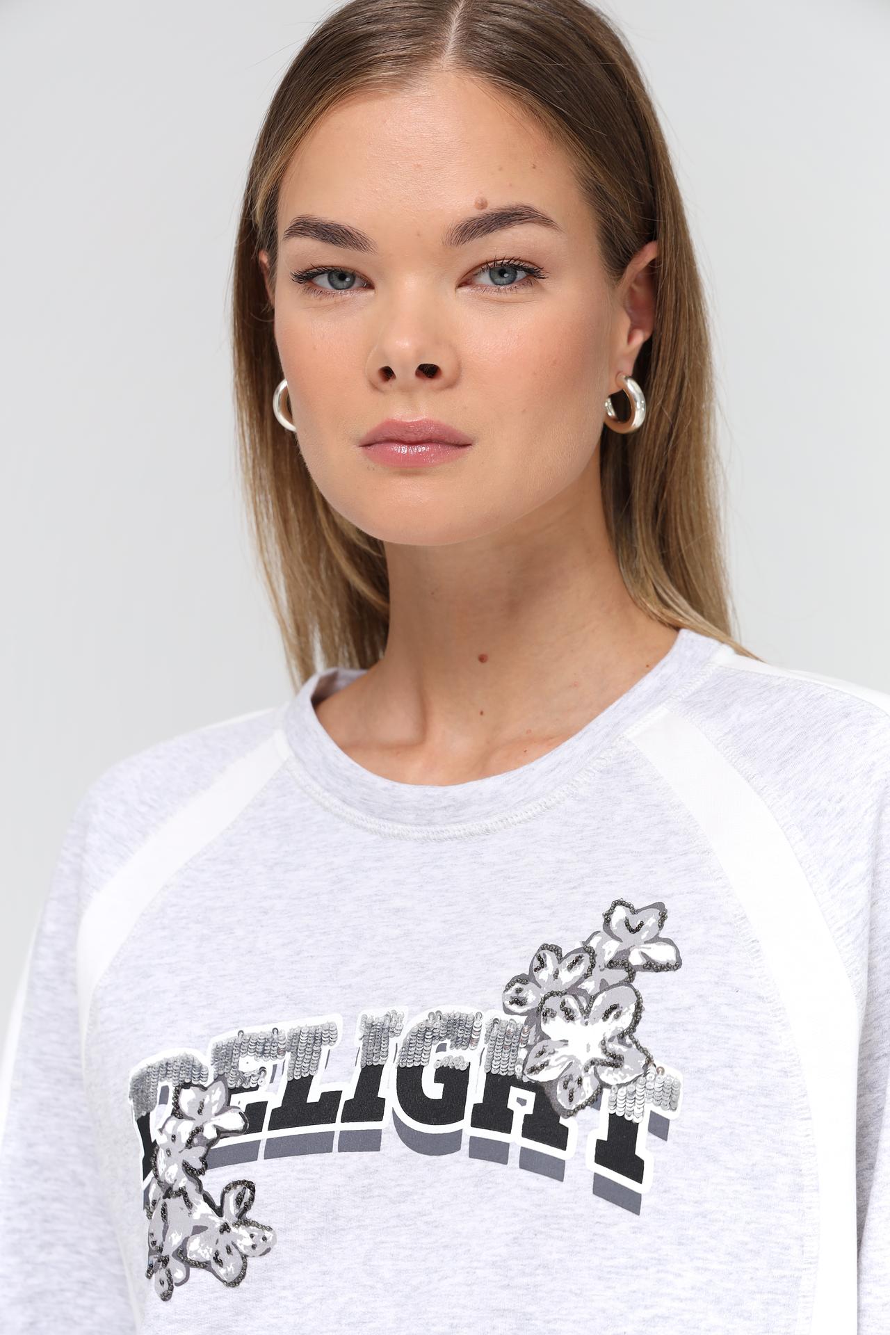 Дизайн пуловера дополнен оригинальной вышивкой и блестящими пайетками, которые добавляют изделию изюминку и делают его по-настоящему особенным. Контрастные белые вставки по бокам и на рукавах создают интересный визуальный эффект и подчеркивают современный крой модели. Классический круглый вырез и свободный силуэт гарантируют максимальный комфорт при носке.