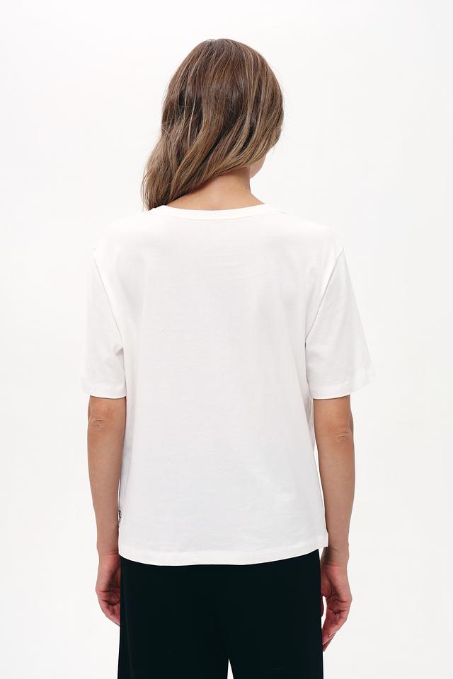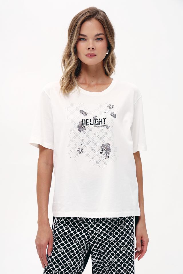 Белая футболка Marc Cain Delight из 100% хлопка с оригинальным принтом и аппликациями. Эта модель свободного кроя станет отличным дополнением к вашему повседневному гардеробу, сочетая в себе комфорт и стиль. Состав: хлопок 100%