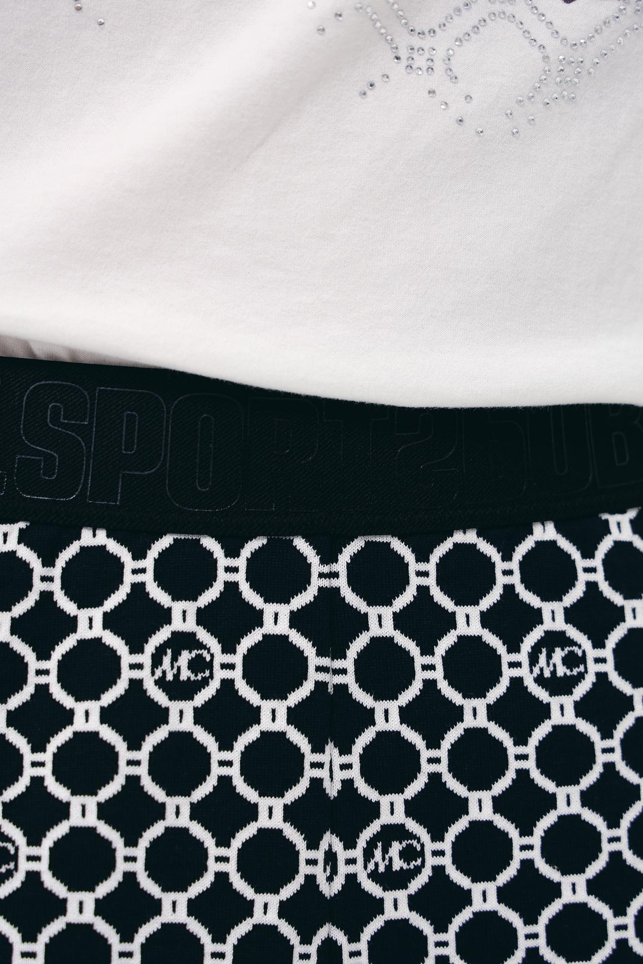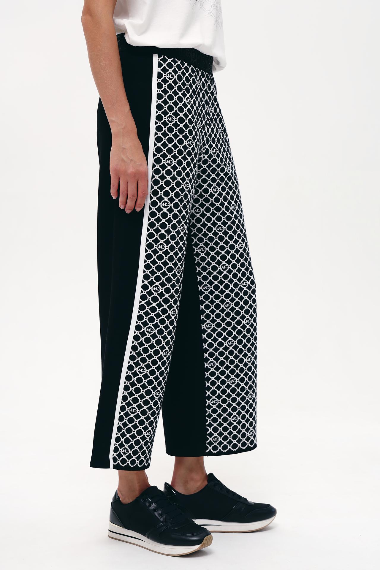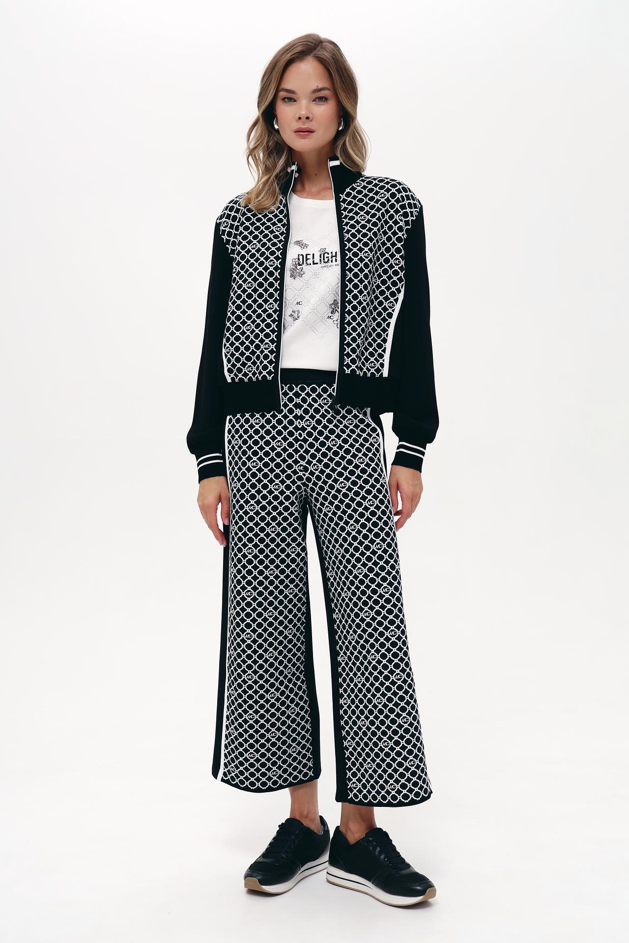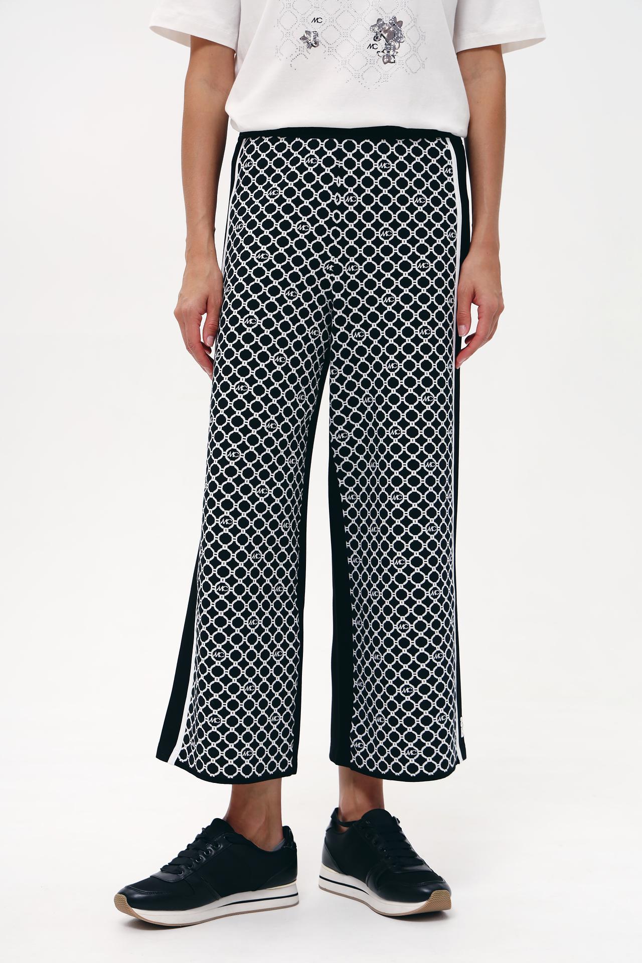 - Дизайн: Сочетание черной основы с изысканным белым принтом и лампасами создает эффектный и современный вид. Брюки легко впишутся как в повседневный, так и в более нарядный гардероб.