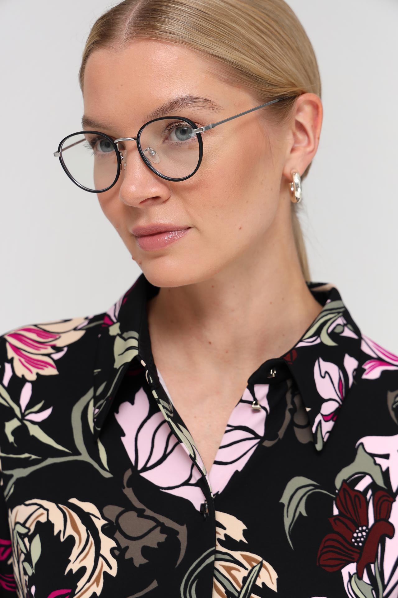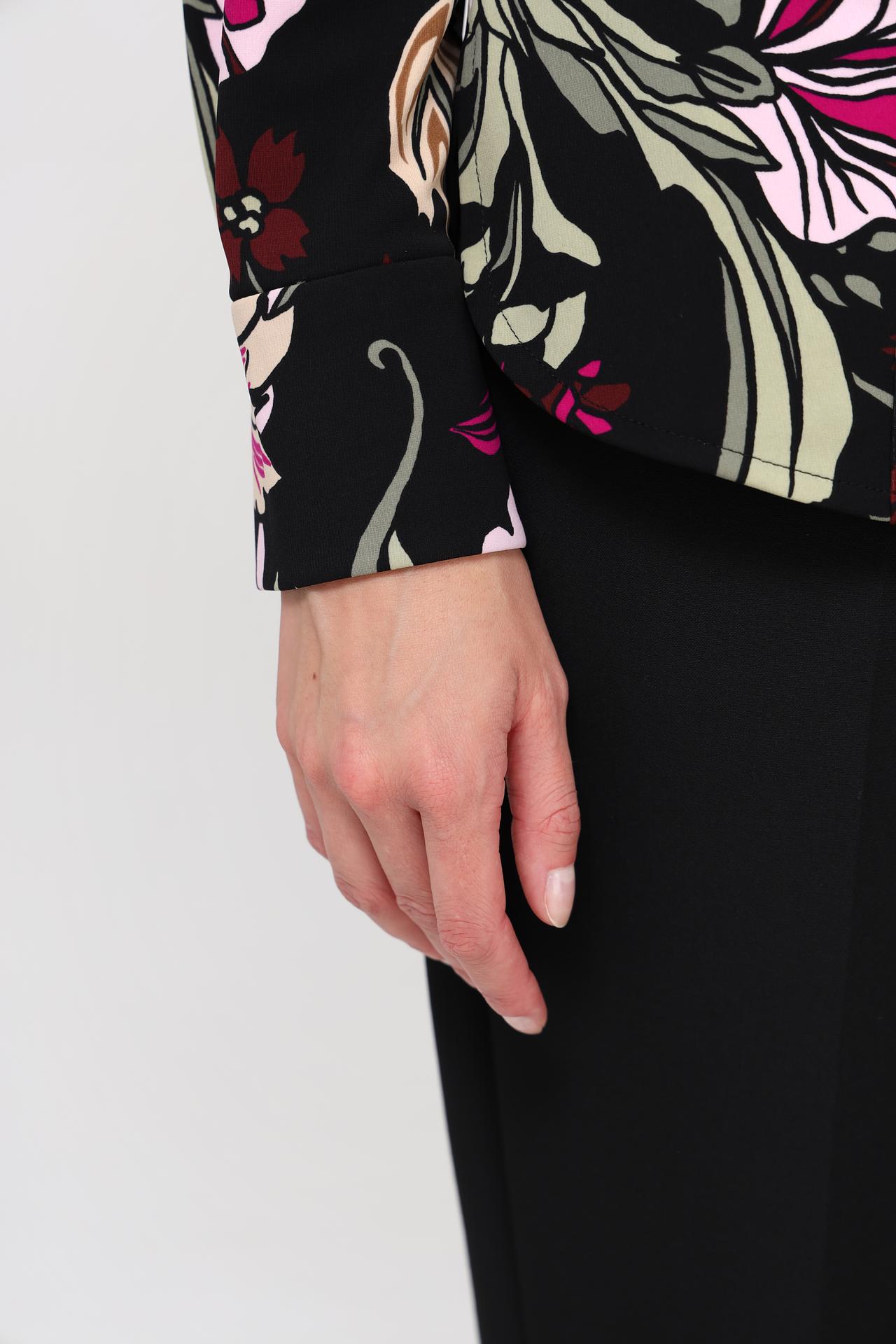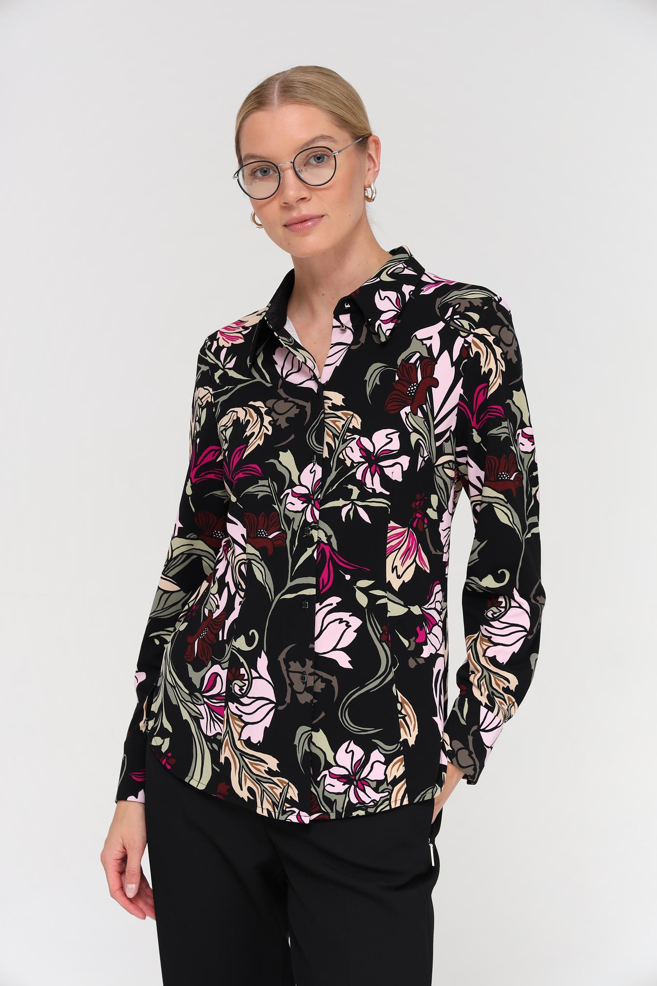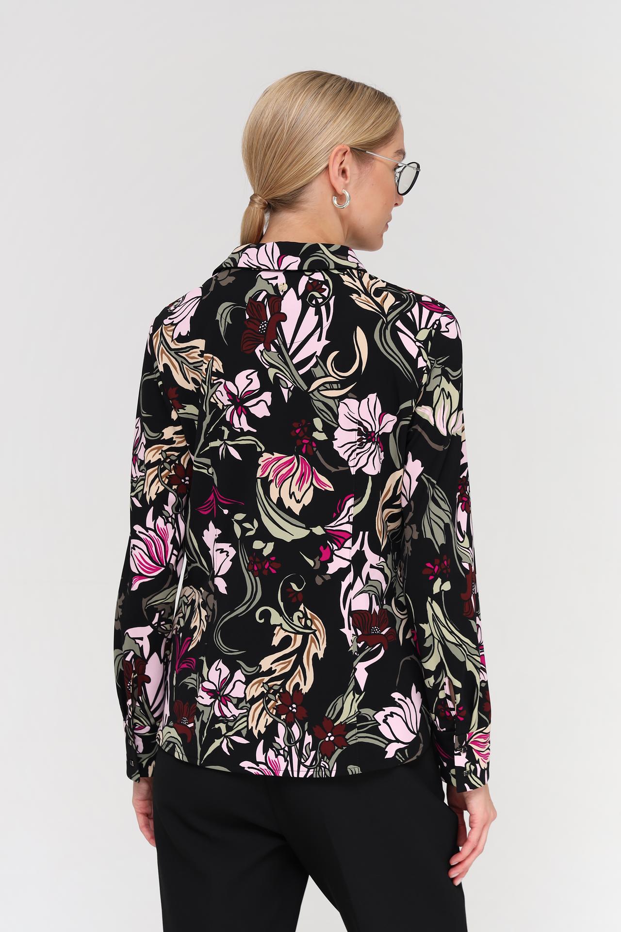- Дизайн: Яркий цветочный узор на черном фоне делает эту блузу по-настоящему уникальной. Классический крой и отложной воротник добавляют элегантности.