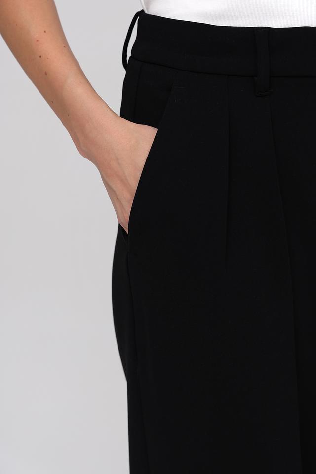 Брюки имеют прямой крой и широкие штанины, что обеспечивает свободу движений и комфорт в носке. Высокая посадка визуально удлиняет ноги и подчеркивает талию. На брюках предусмотрены боковые карманы, добавляющие функциональности.