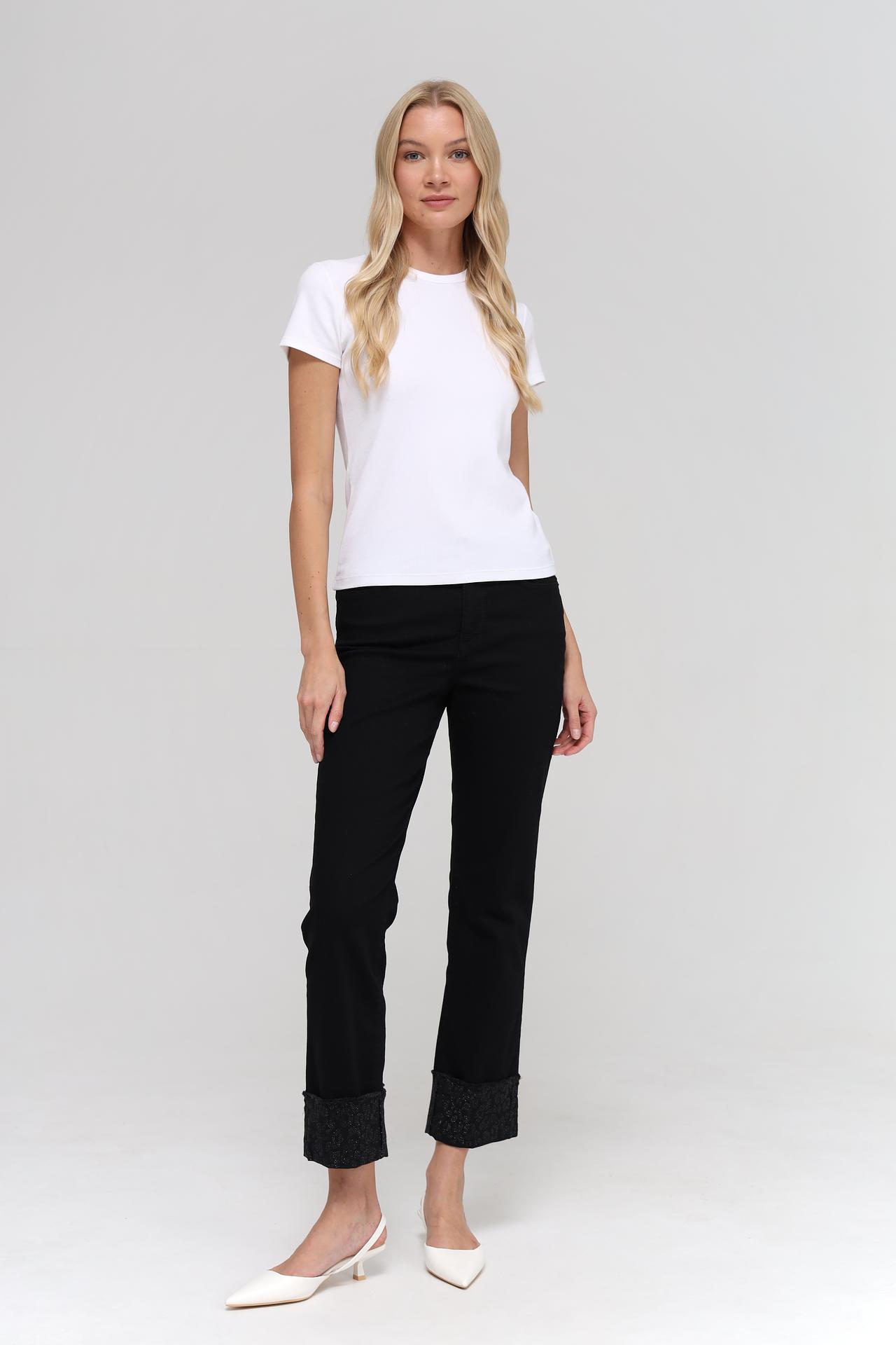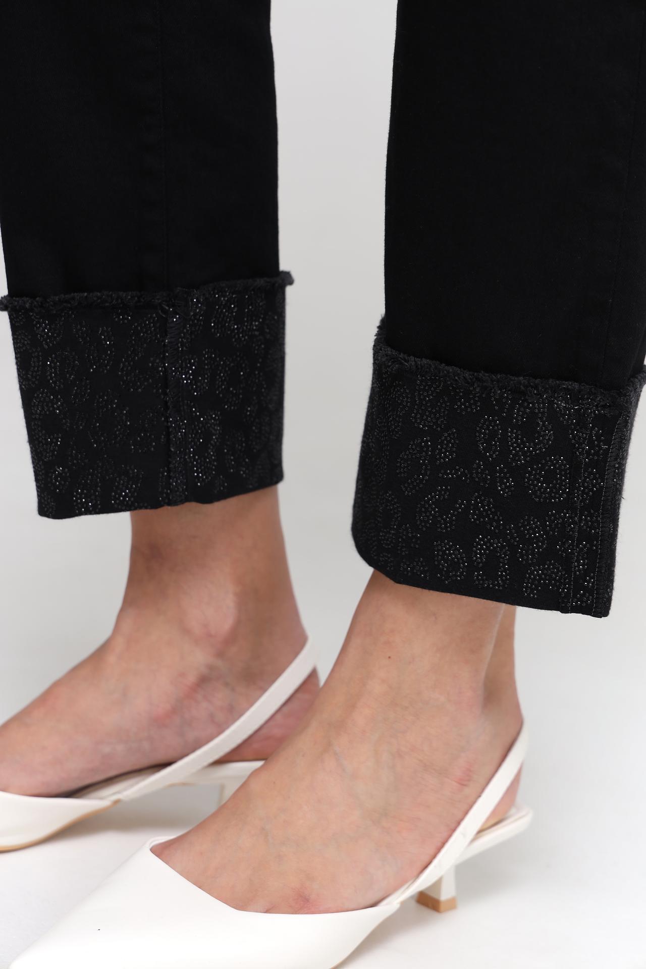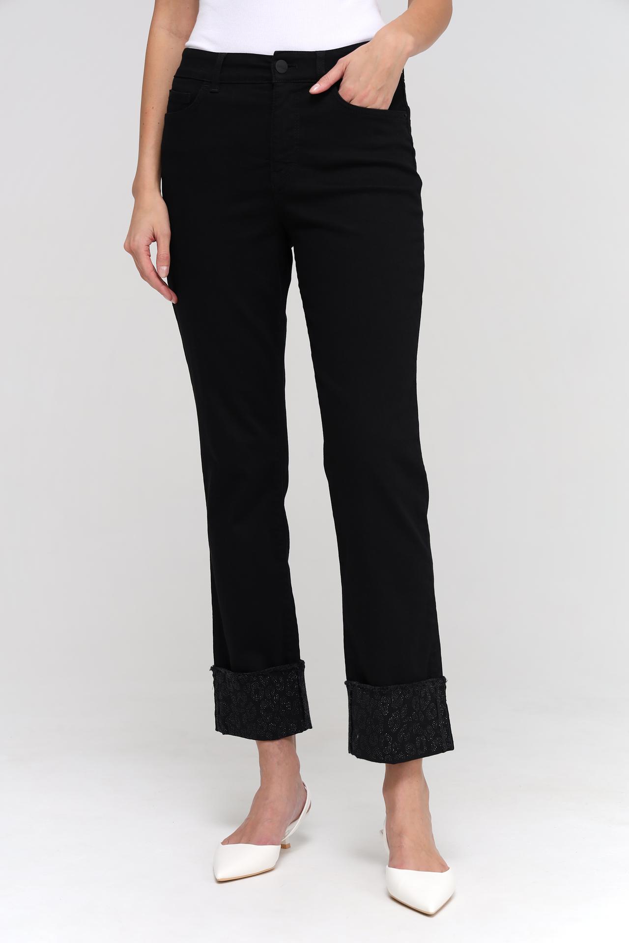 - Дизайн: Прямой крой и классическая черная расцветка делают джинсы универсальными. Оригинальный декор в виде кружевной отделки по нижнему краю штанин придает модели женственность и изысканность.