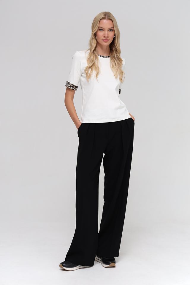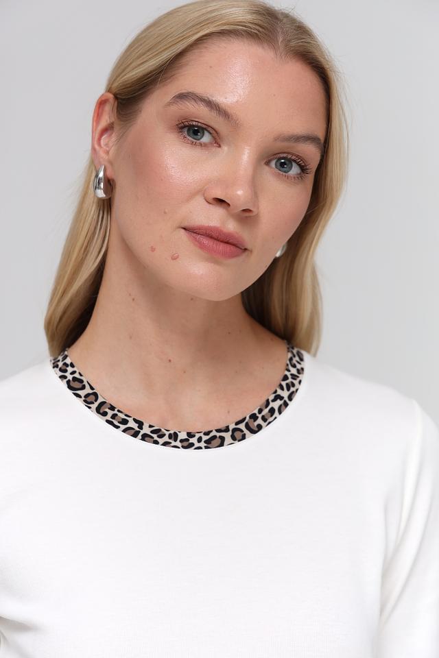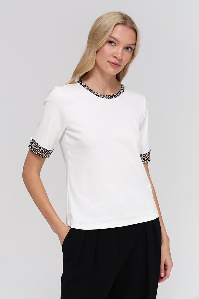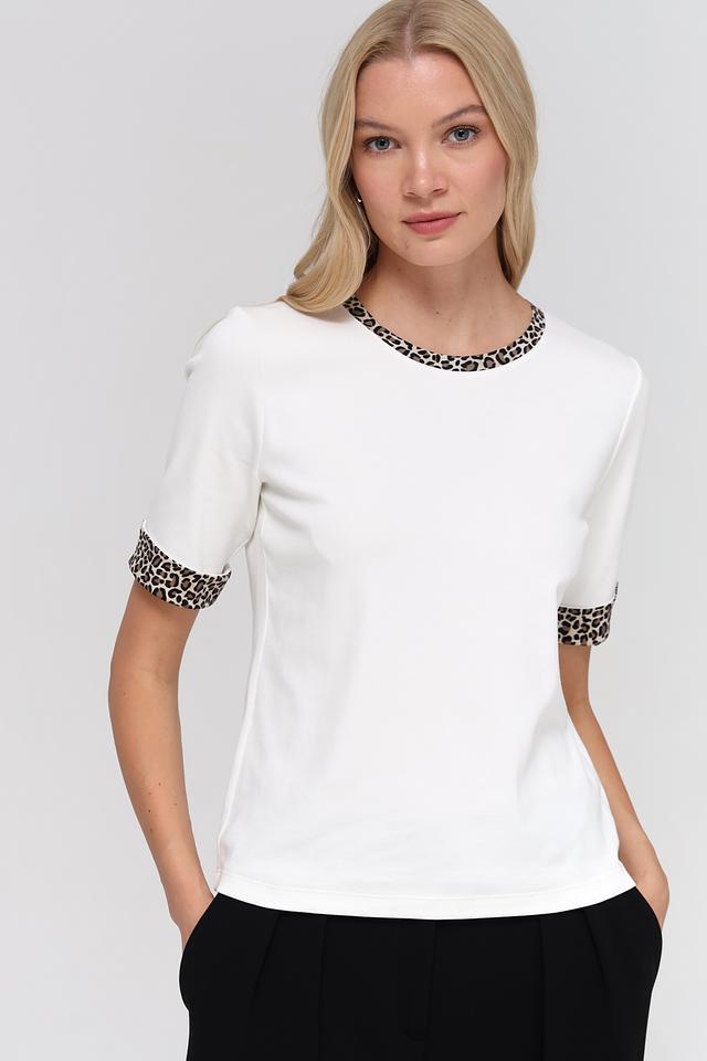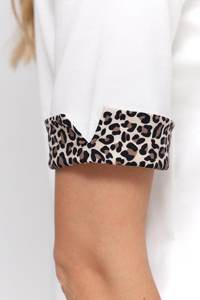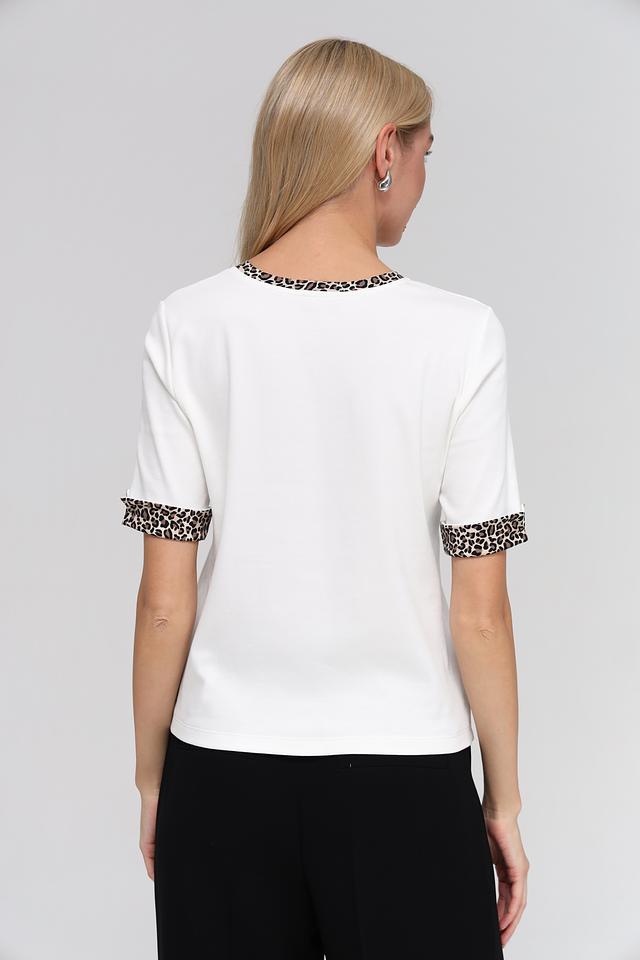 Основной цвет футболки – белый, что делает ее универсальной и легко сочетаемой с другими элементами одежды. Особый акцент в дизайне – это леопардовый принт, который присутствует на воротнике и манжетах рукавов, придавая образу оригинальность и динамичность.