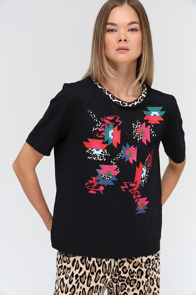 Футболка имеет прямой крой, короткие рукава и круглый вырез горловины, отделанный леопардовым принтом. Изготовлена из высококачественного 100% хлопка, что обеспечивает приятные ощущения при носке и хорошую воздухопроницаемость.