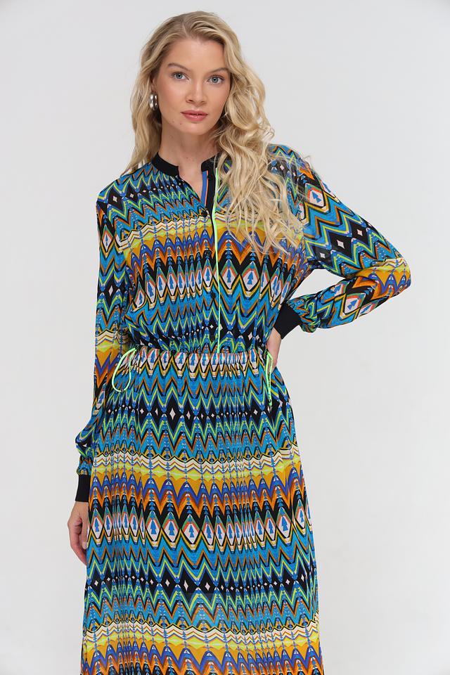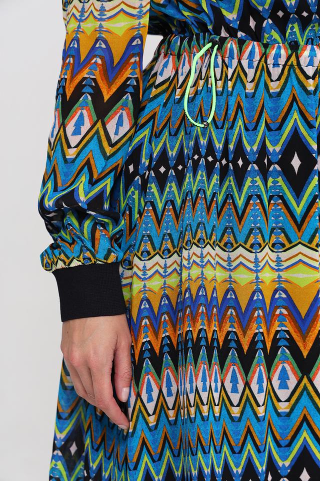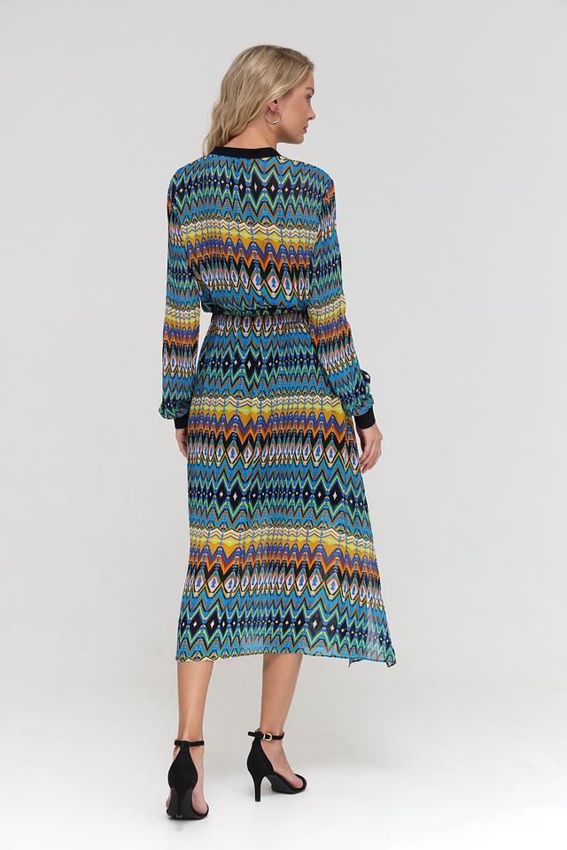 Платье имеет длину миди, длинные рукава с манжетами и воротник-стойку с V-образным вырезом. Талия подчеркнута приталенным кроем и поясом, что позволяет создать женственный силуэт. Яркий геометрический принт делает это платье уникальным и привлекательным.