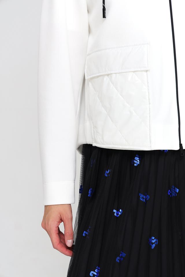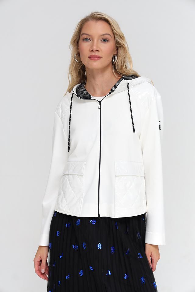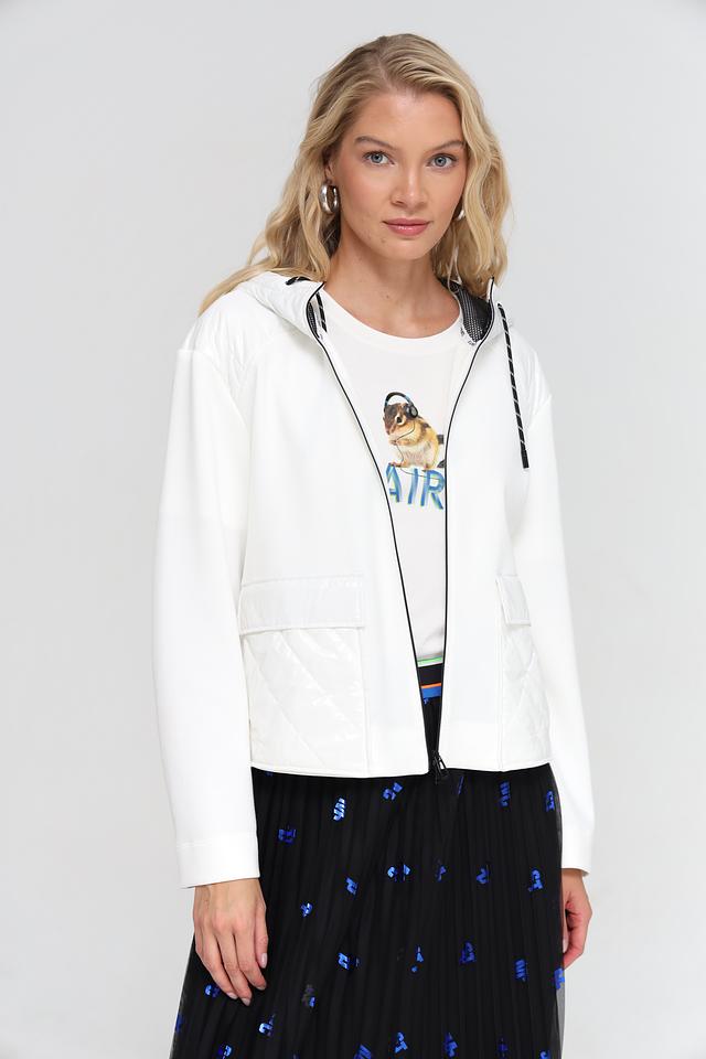 Жакет имеет удобный капюшон с черной сеткой и белой подкладкой, а также стеганую отделку на плечах и спине, что придает ему современный вид. Застежка-молния с черными тесьмой добавляет контраст и подчеркивает динамичный характер модели.