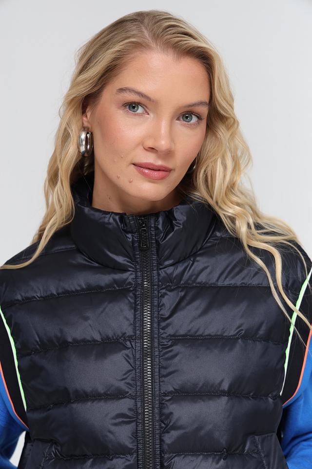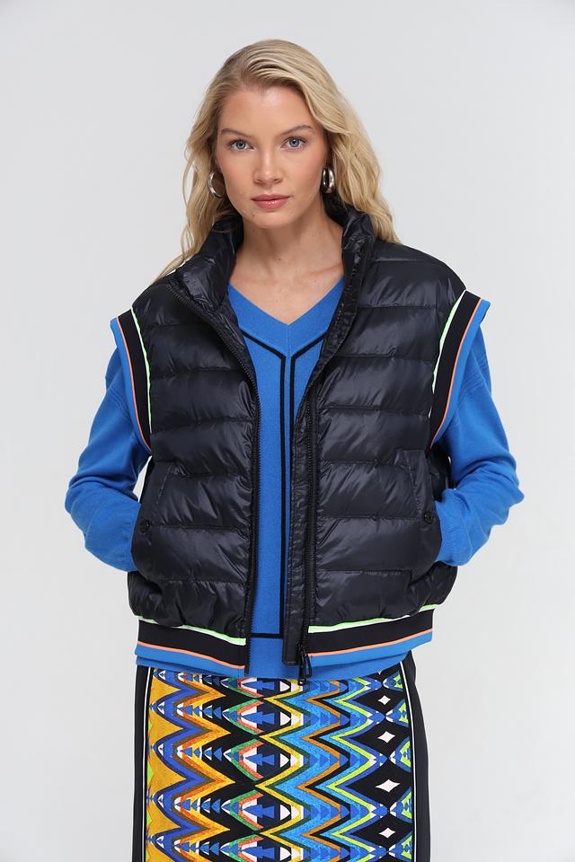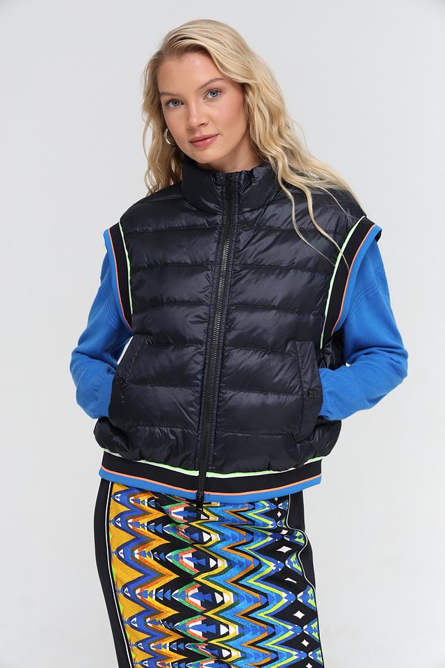 Модель имеет высокий воротник и застегивается на молнию. Отличительной особенностью жилета является яркая контрастная окантовка по краям, выполненная в неоновых оттенках. Жилет имеет удобные боковые карманы.