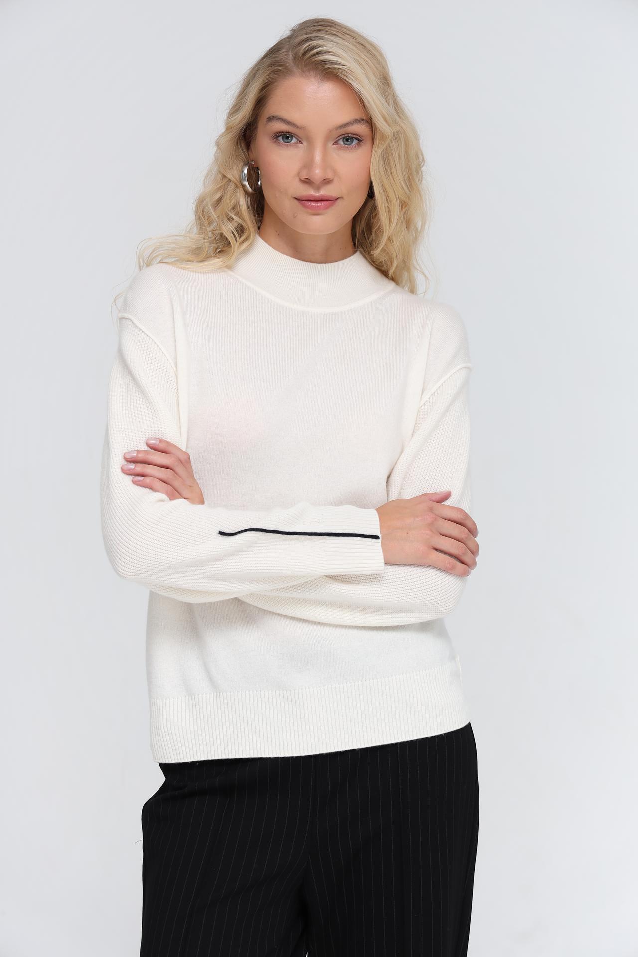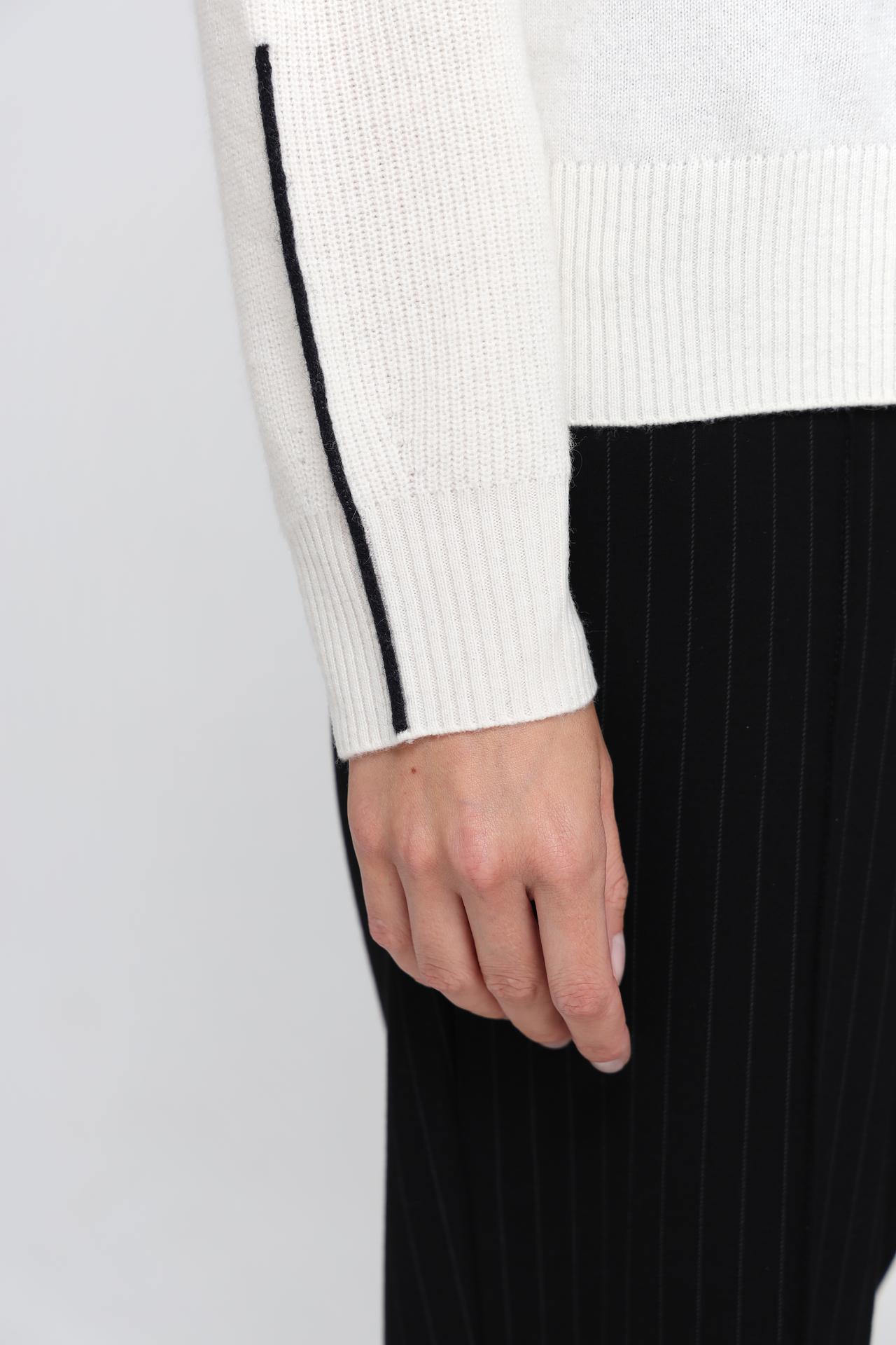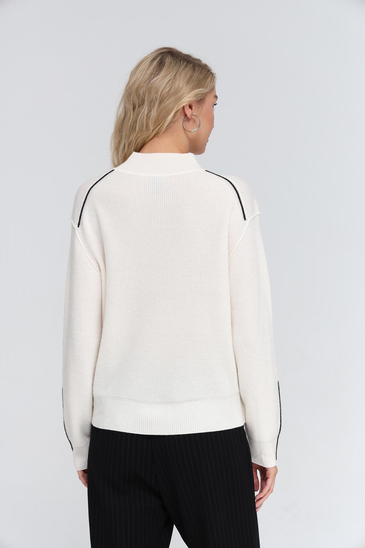 - Элегантный дизайн: Модель отличается свободным кроем, высоким воротником-стойкой и контрастными швами, которые подчеркивают линии силуэта. Классический белый цвет позволяет легко интегрировать пуловер в любой гардероб.