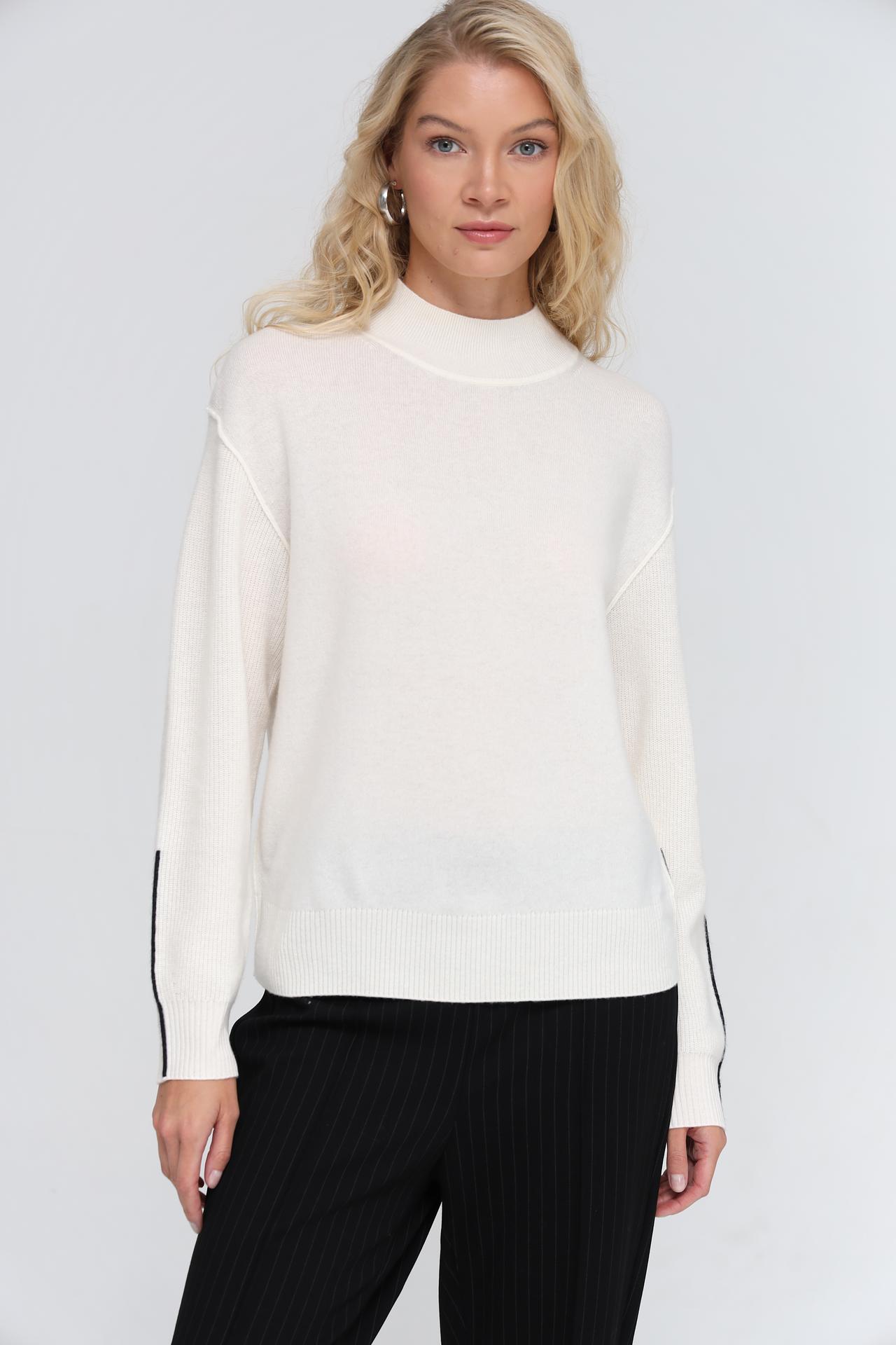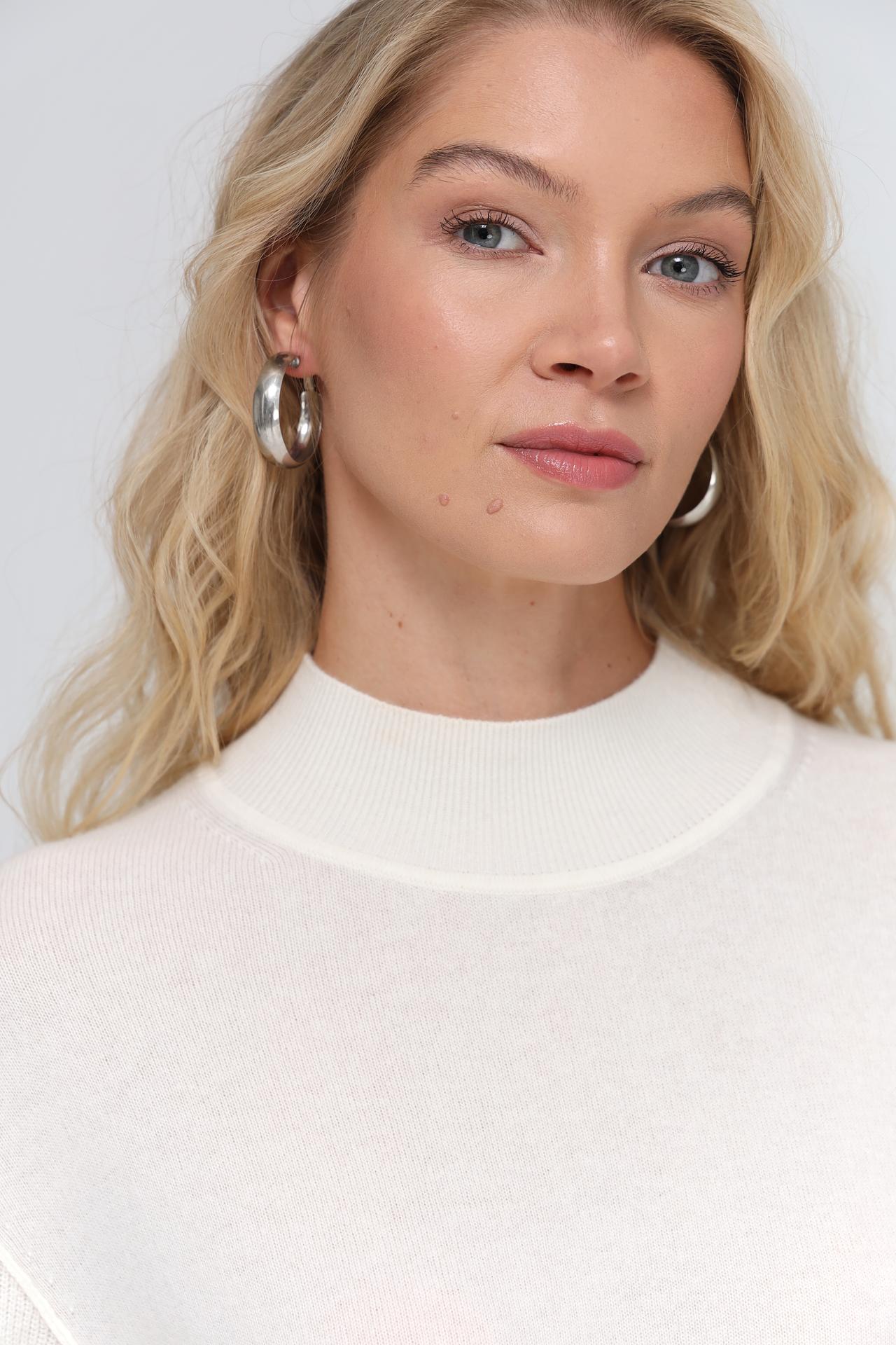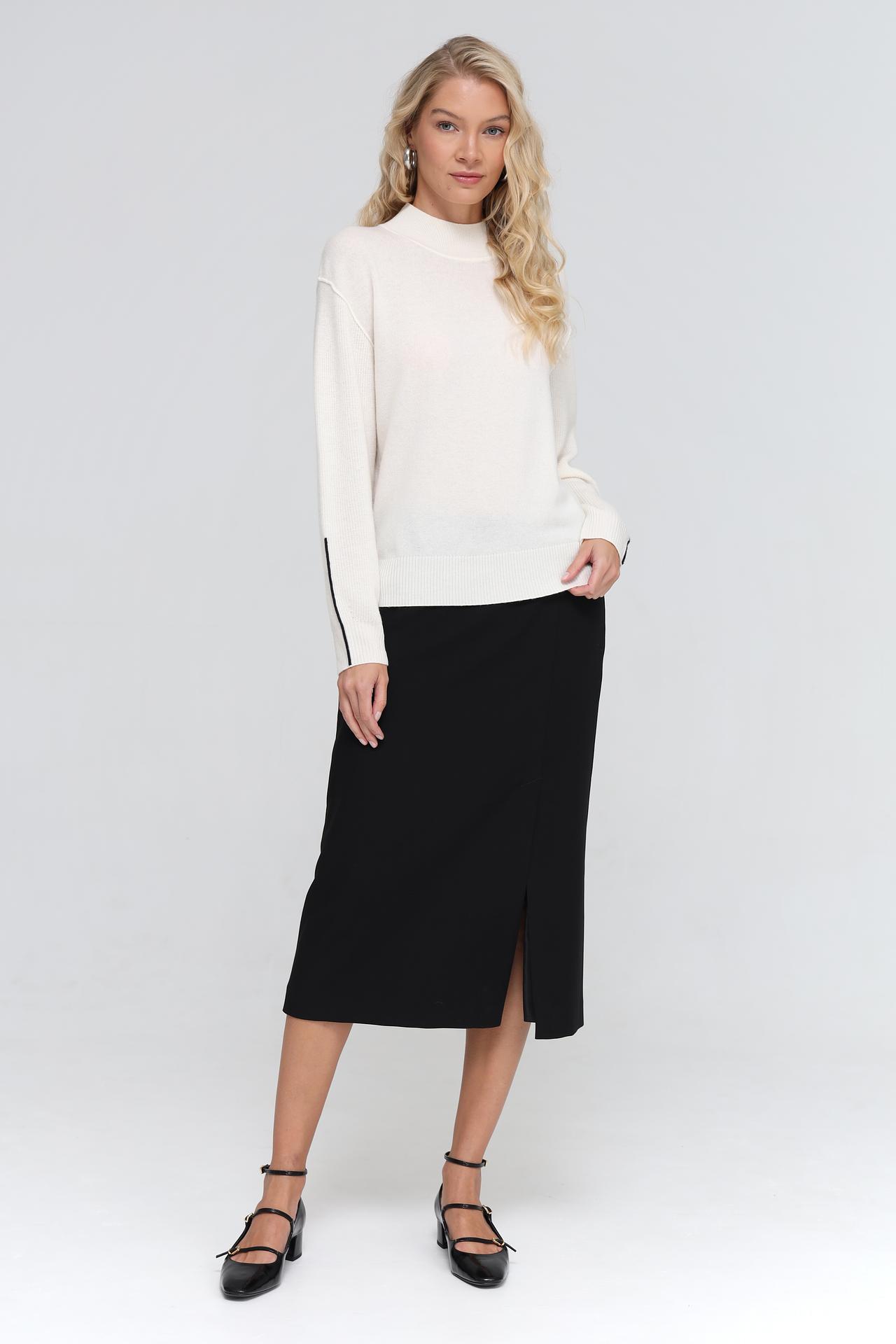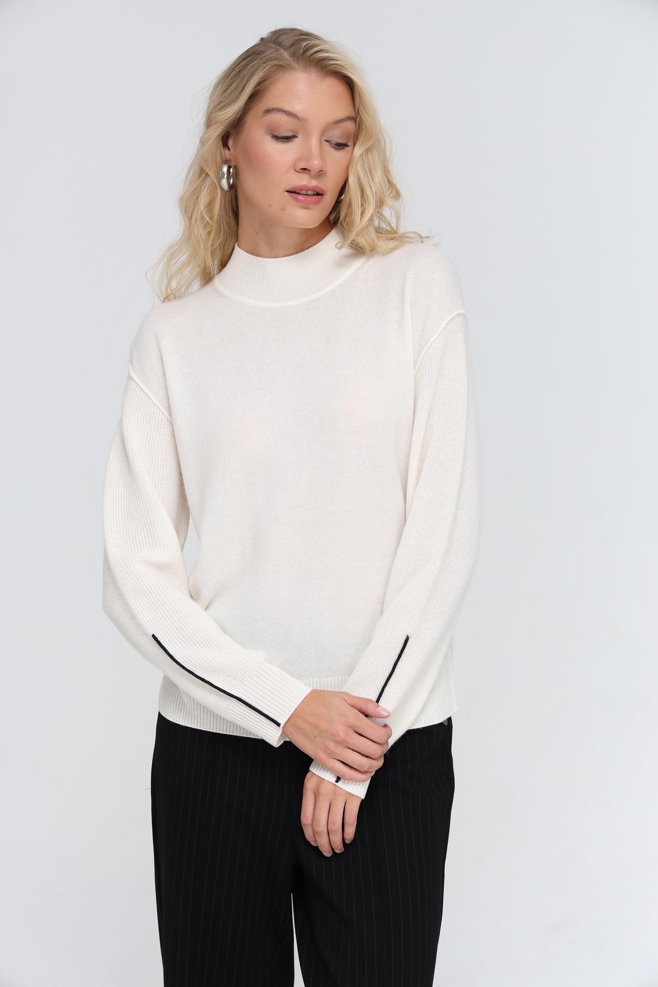 - Элегантный дизайн: Модель отличается свободным кроем, высоким воротником-стойкой и контрастными швами, которые подчеркивают линии силуэта. Классический белый цвет позволяет легко интегрировать пуловер в любой гардероб.