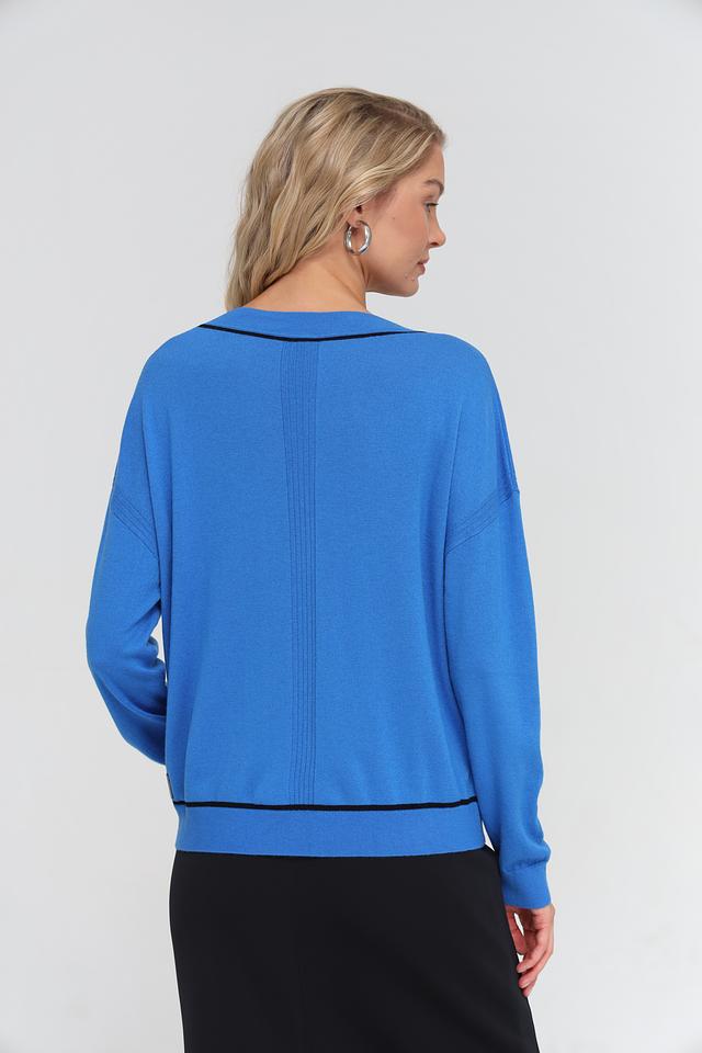 Пуловер имеет V-образный вырез, который подчеркивает линию шеи, и аккуратную чёрную отделку по вырезу и низу изделия. Свободный крой обеспечивает комфортную посадку по фигуре, а длинные рукава делают его идеальным для прохладной погоды.