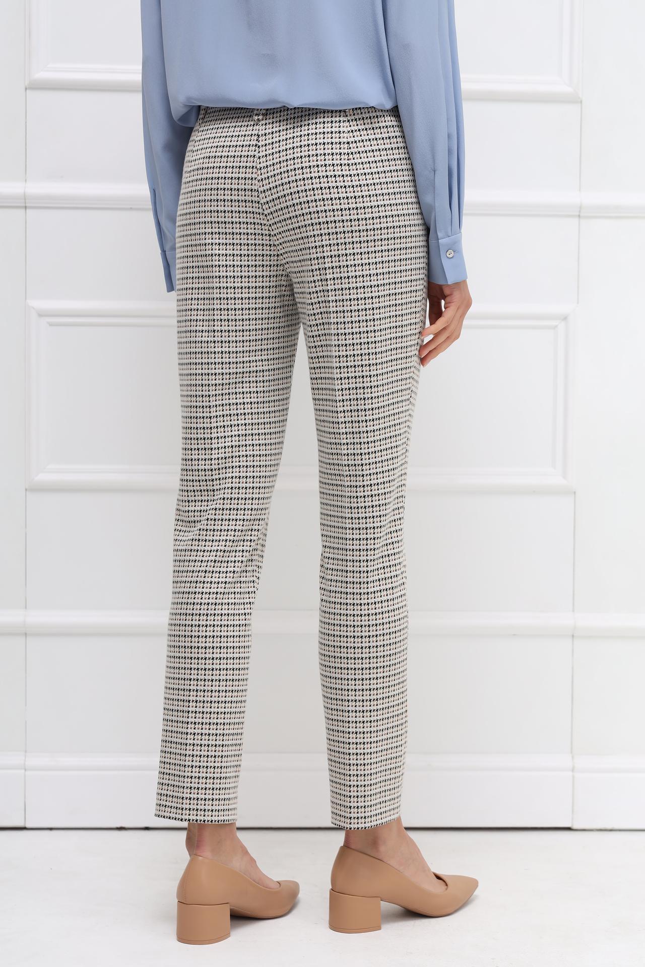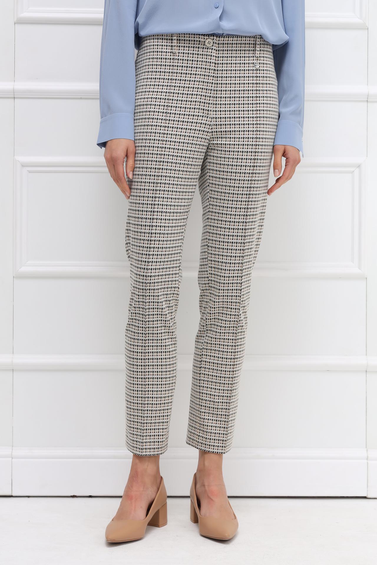 Брюки представлены в актуальном бежевом цвете в мелкую клетку. Они станут прекрасным дополнением к вашему гардеробу, позволяя создавать как строгие офисные, так и неформальные повседневные образы.
