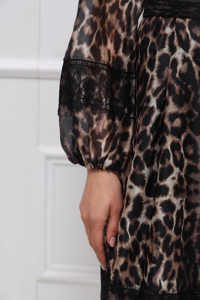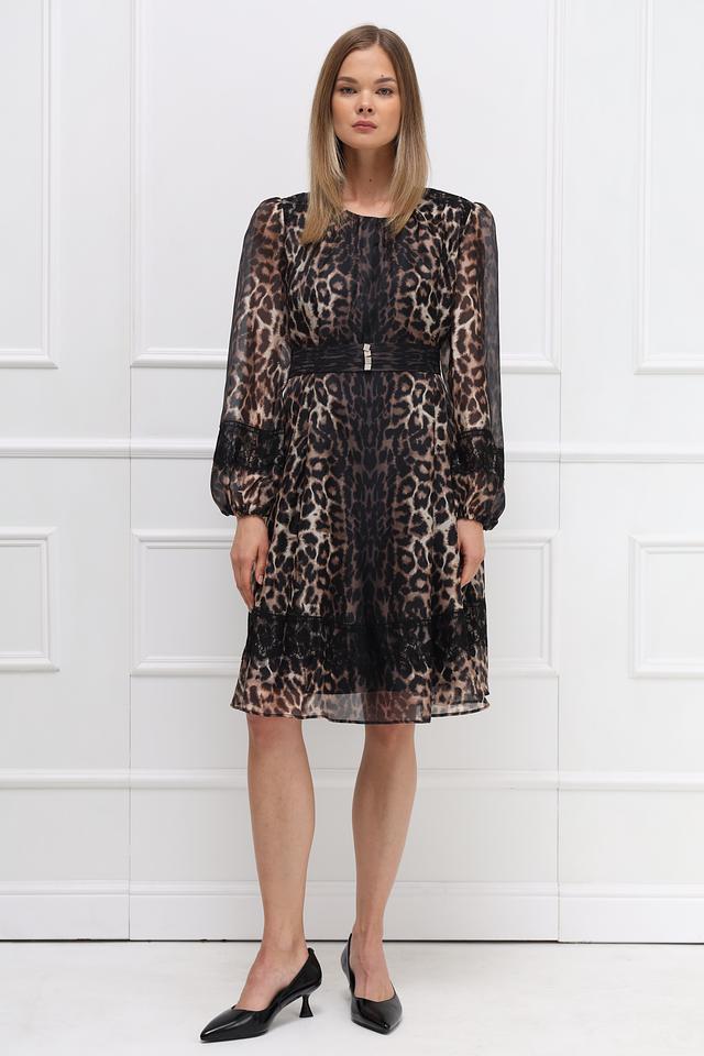 Платье Marc Cain в леопардовый принт – элегантная модель длиной до колена с длинными рукавами и декоративным поясом. Изготовлено из полупрозрачной ткани с кружевными вставками, что придает образу легкость и женственность. Состав: полиэстер 100%