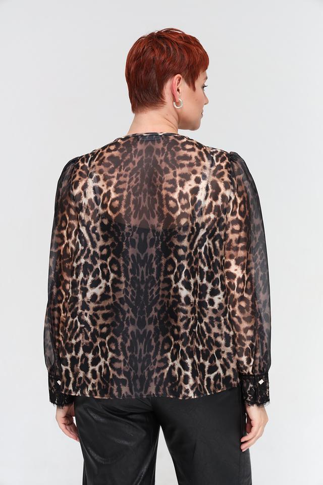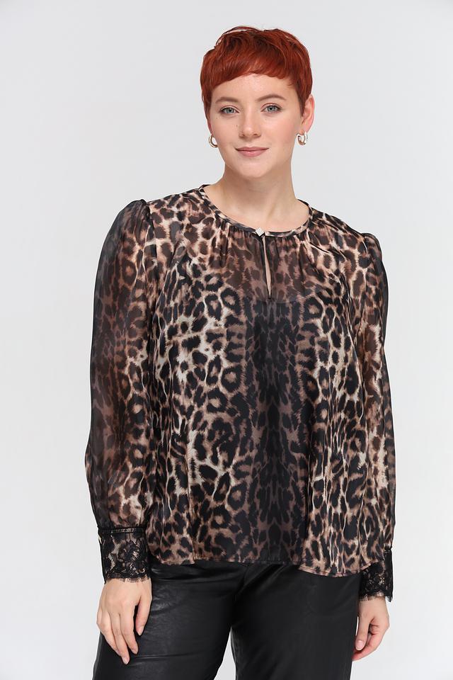Блуза имеет свободный крой, длинные рукава и круглый вырез горловины, который дополнен небольшим разрезом и завязкой. Полупрозрачная ткань с леопардовым принтом придает модели изысканность и женственность.