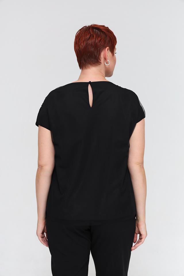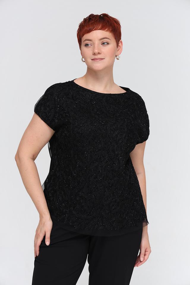 Блуза имеет классический чёрный цвет и украшена изысканной вышивкой, придающей ей особый шарм. Округлый вырез горловины и короткие рукава делают её универсальной для различных случаев.
