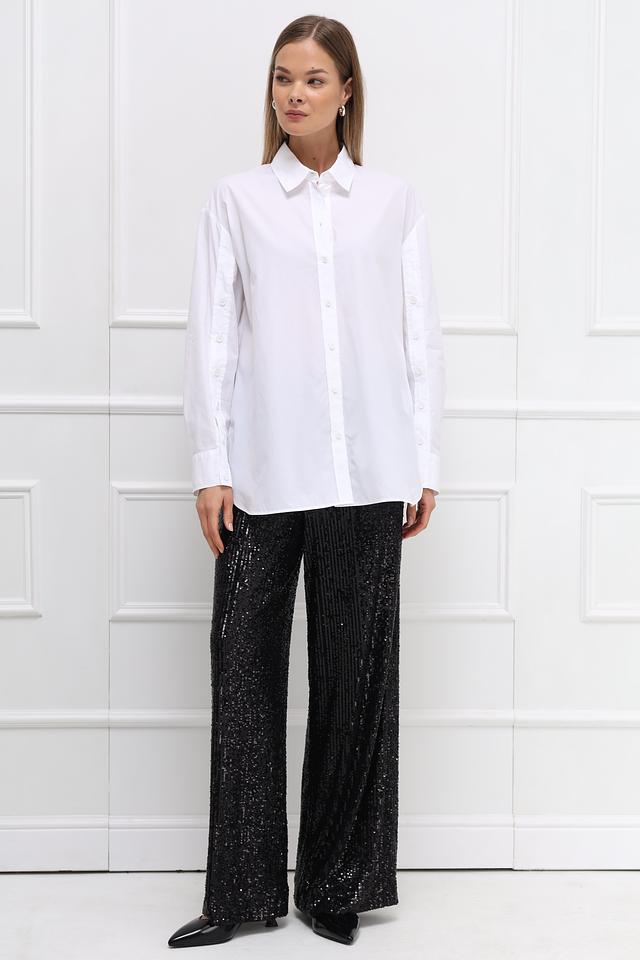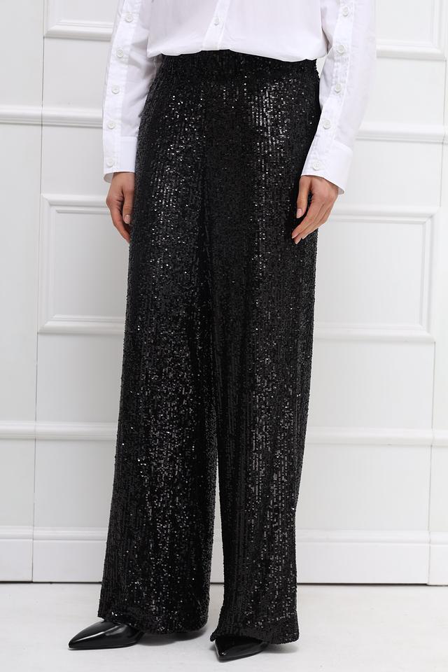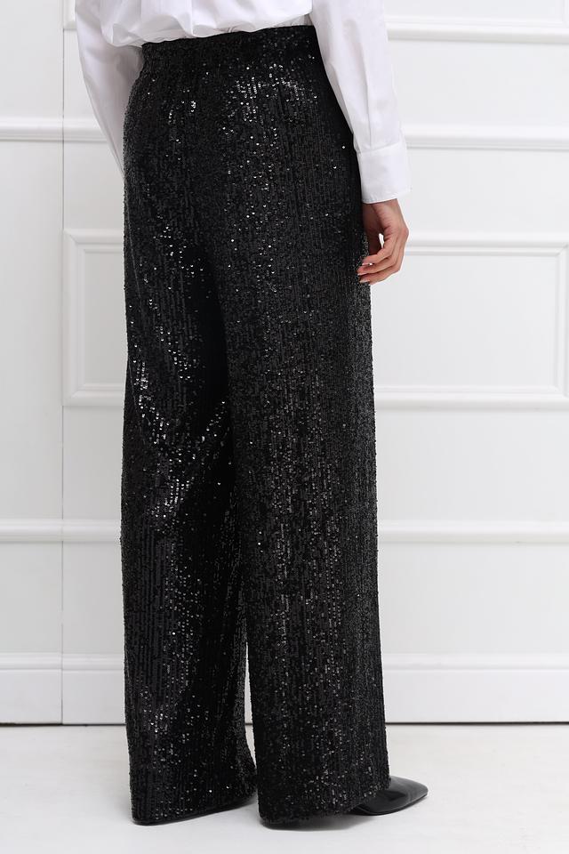 Брюки полностью покрыты мерцающими пайетками, создающими роскошный и праздничный вид. Прямой крой и эластичный пояс обеспечивают свободу движений и удобство в носке. Данная модель идеально подойдет для особых случаев и вечерних выходов.
