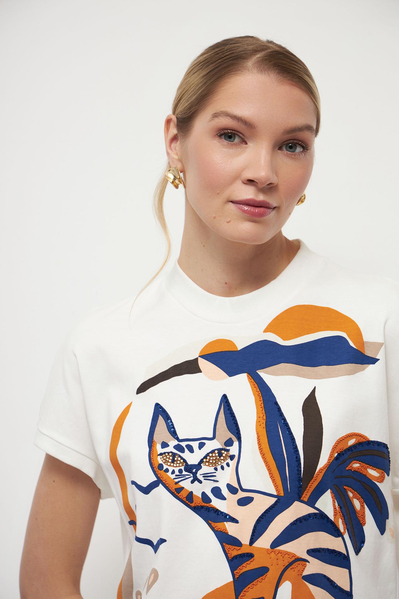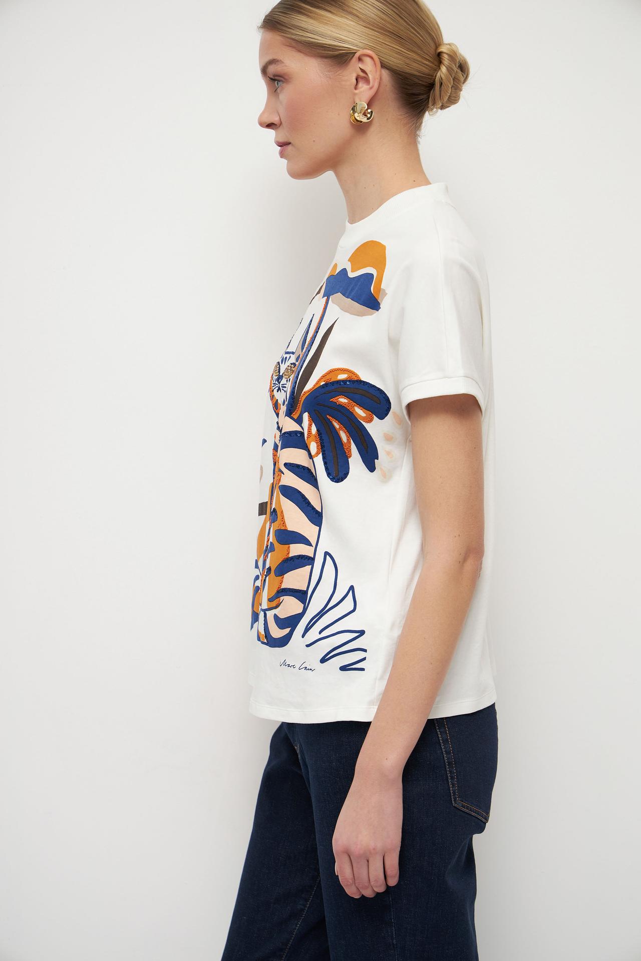 Особое внимание привлекает яркий и оригинальный принт с изображением кота, выполненный в выразительной оранжево-синей палитре. Глаза кота украшены деликатными пайетками, добавляющими изделию блеска и уникальности. Этот художественный элемент делает футболку Marc Cain не просто базовой вещью, а акцентной деталью, подчёркивающей индивидуальность.