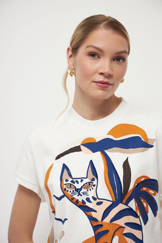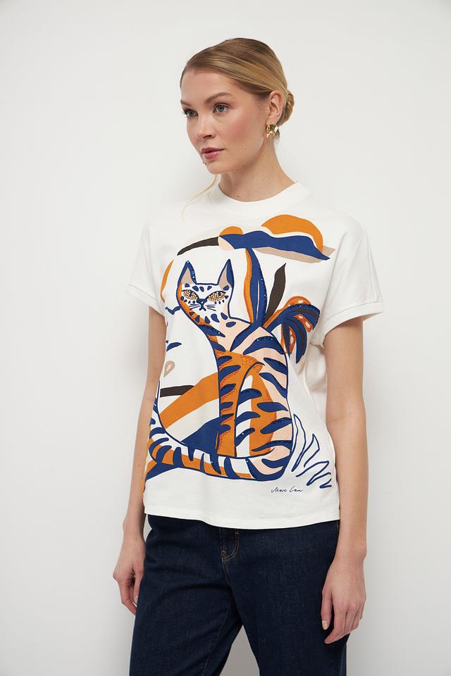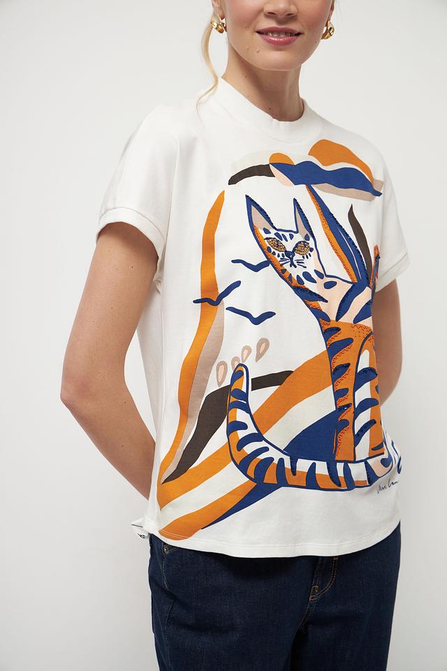 Особенностью данной модели является оригинальный принт с изображением кота, окруженного тропическими листьями, выполненный в насыщенных оранжевых и синих тонах. Этот принт добавляет футболке игривости и индивидуальности.
